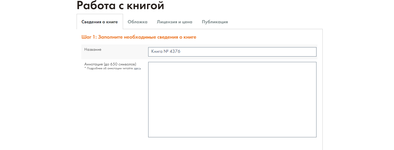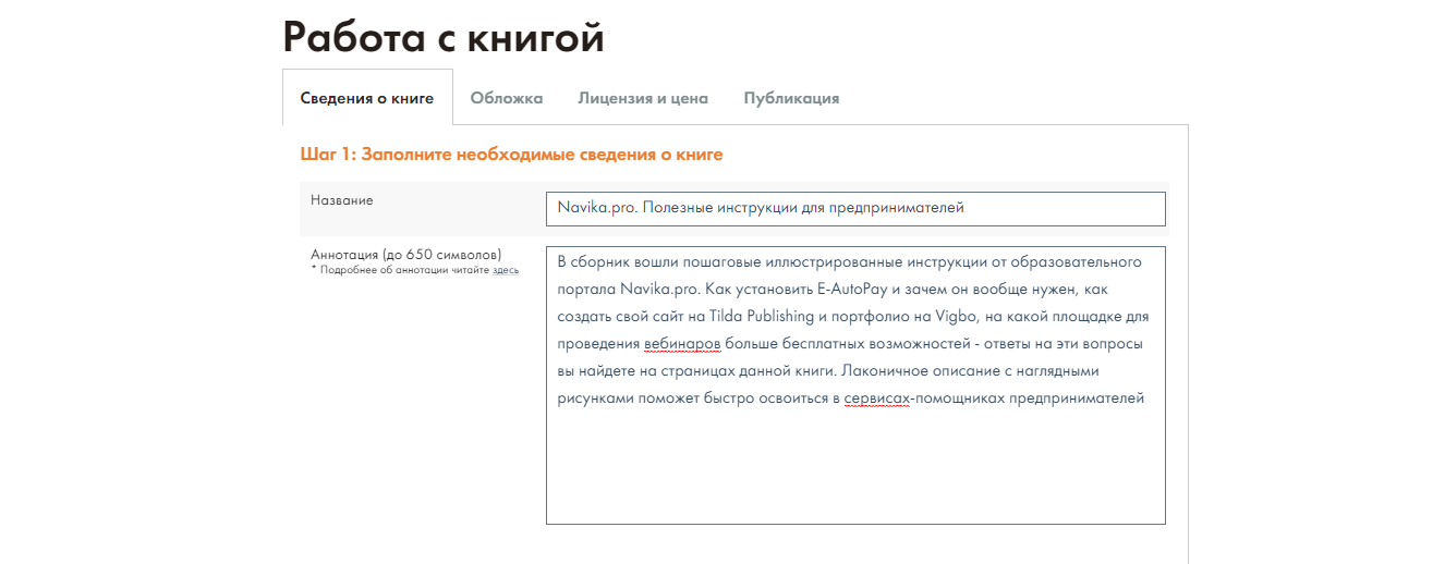 В разделе «Сведения о книге» указываем название и краткую аннотацию.