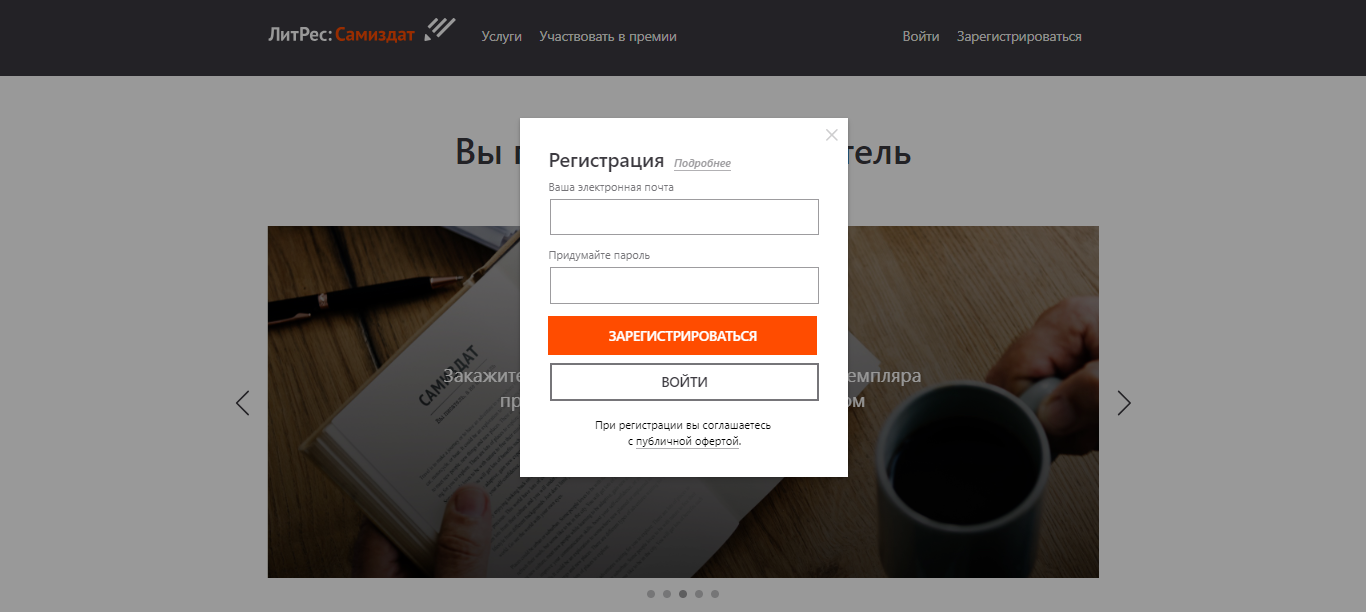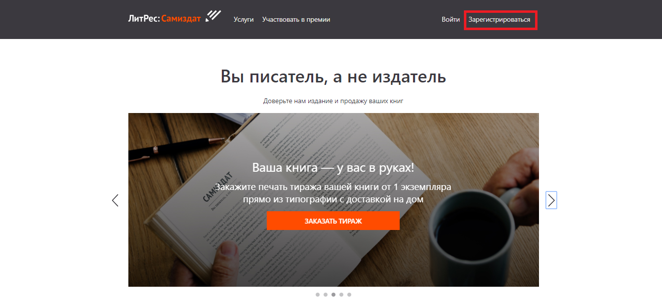 Шаг 2. Когда рукопись готова, заходим на издательскую платформу «ЛитРес» — www.selfpub.ru. Нажимаем на кнопку «Зарегистрироваться».