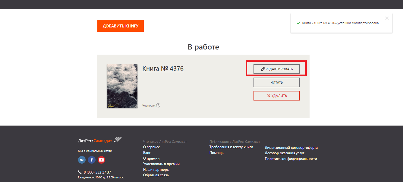 Шаг 6. Теперь нужно отредактировать данные о нашей книги. Для этого возвращаемся на главную страницу и нажимаем на кнопку «Редактировать».