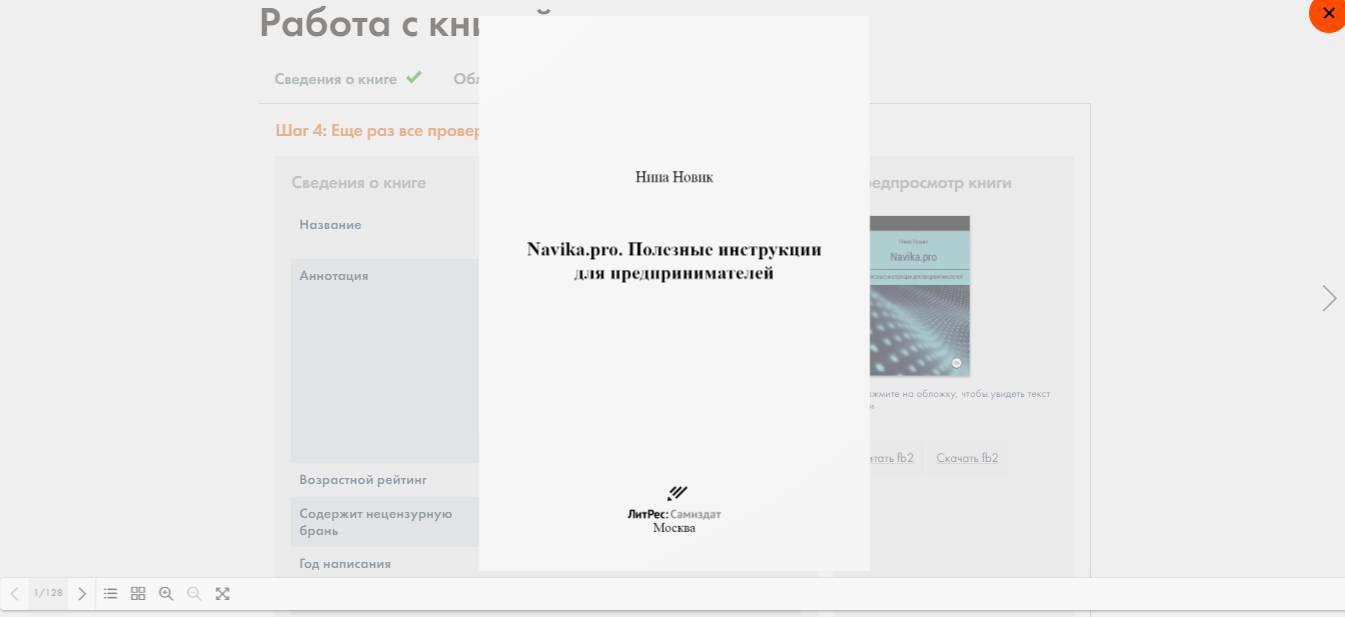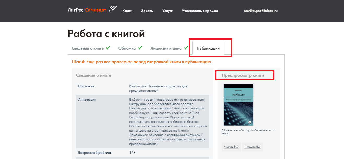 Шаг 7. Остался последний шаг — отправить книгу на публикацию. Выбираем вкладку «Публикация» и еще раз внимательно проверяем выходные данных нашей книги. Здесь же есть функция предпросмотра. Нажмите на обложку книги и «полистайте» ее.