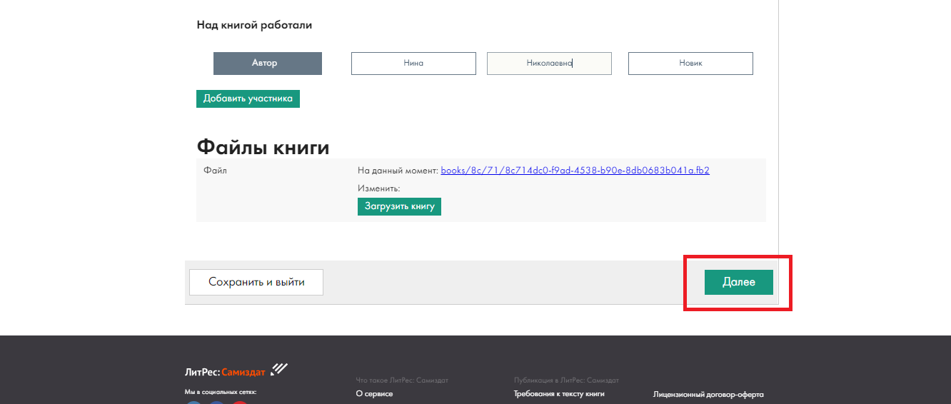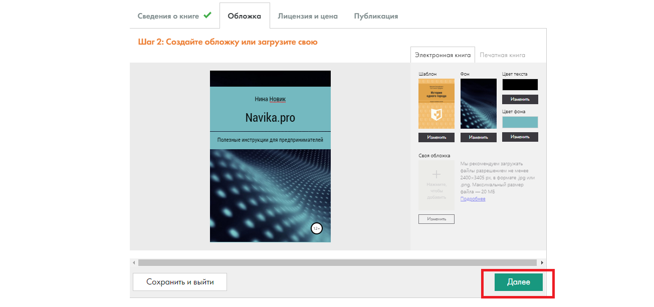 Когда макет обложки готов, нажимаем на кнопку «Далее».