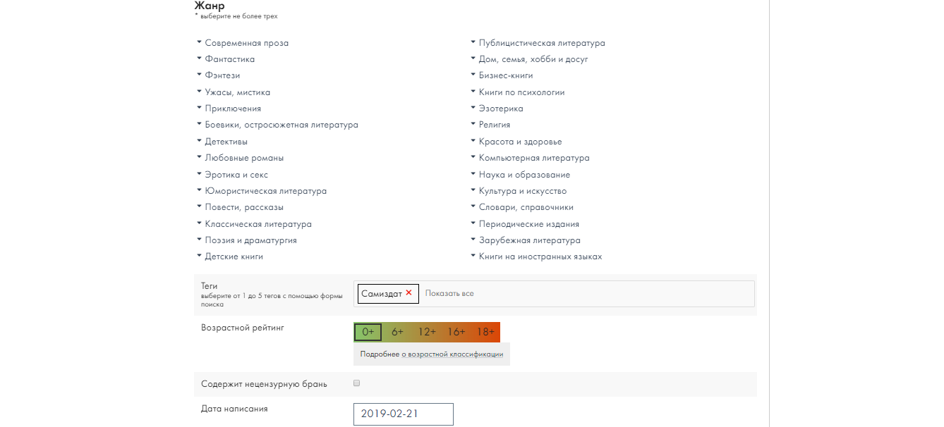 Дальше определяемся с жанром, выбираем теги и возраст целевой аудитории.