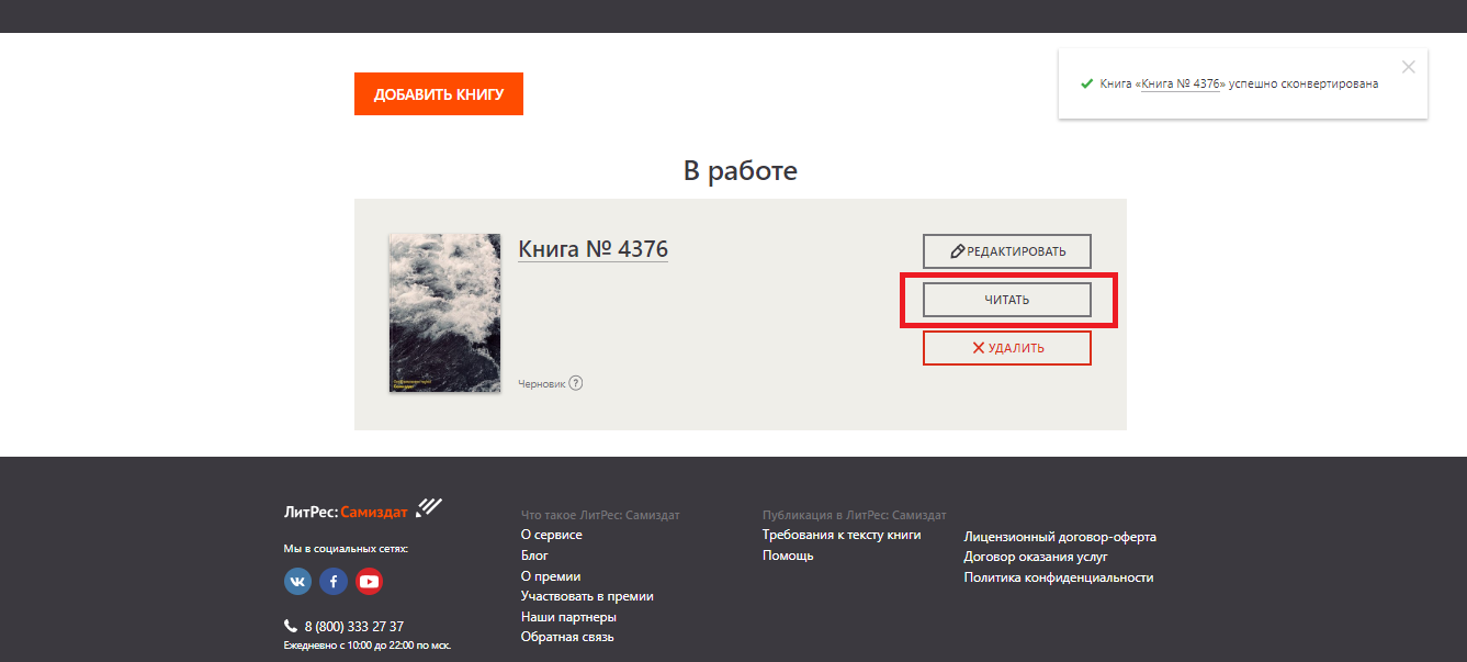 Шаг 5. Книга сконвертирована и практически готова. Чтобы посмотреть, как будет выглядеть текст, нажмем на кнопку «Читать».