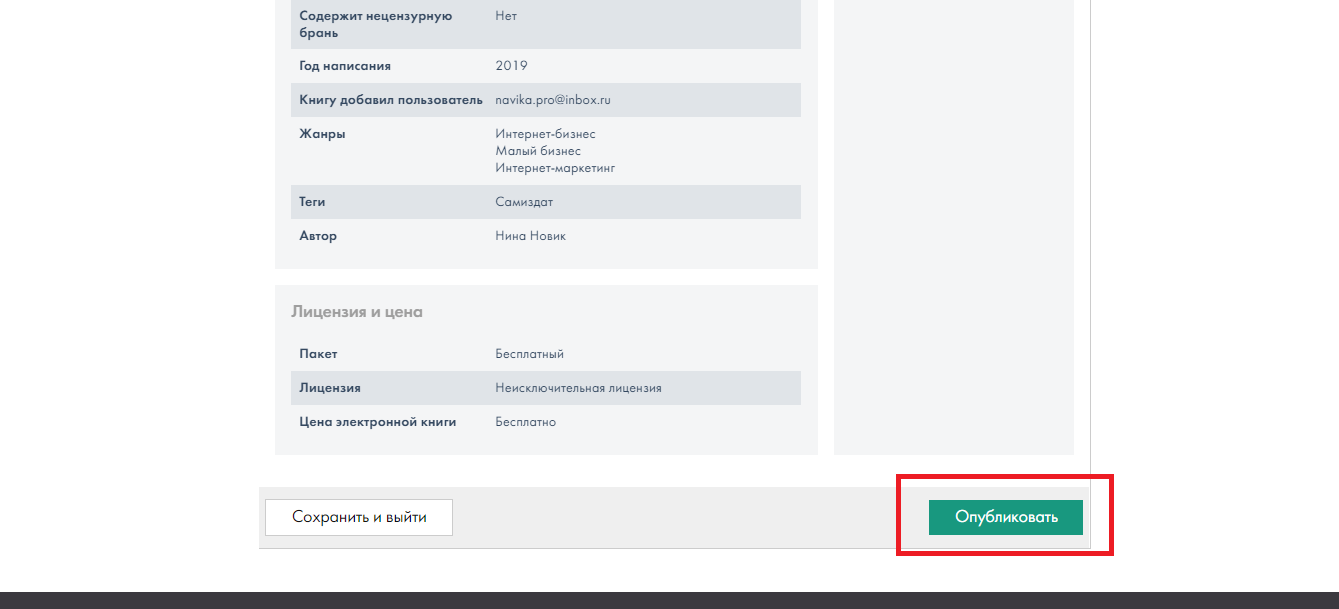 Теперь барабанная дробь — нажимаем на кнопку «Опубликовать» и ждем ответа модератора. Сотрудники «ЛитРес» должны проверить множество параметров: возрастные ограничения, не нарушаете ли вы чьих-то авторских прав, соответствие содержания книги законам РФ и многое другое.