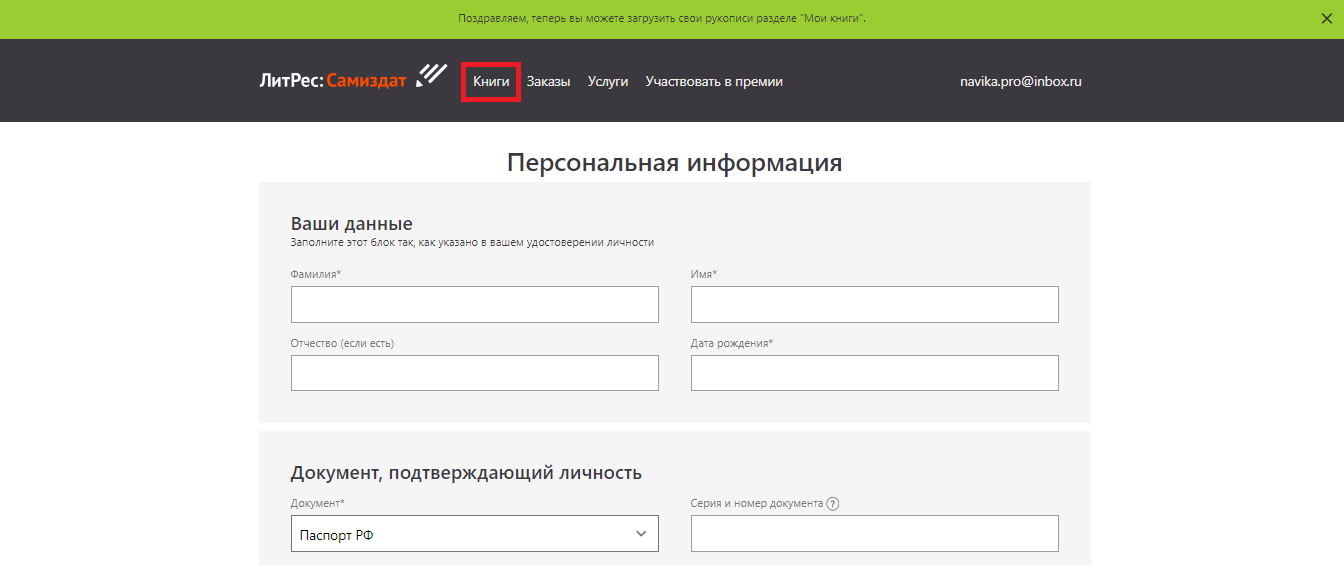 Шаг 3. Мы попадаем в свой профиль на Selfpub.ru, где необходимо ввести ФИО и официальные данные для заключения договора и в последующем начисления авторского гонорара. Эти данные можно вписать сразу или отложить на потом. Ведь сейчас для нас самое главное — создать книгу! Поэтому нажимаем на кнопку «Книги», чтобы уже приступить.