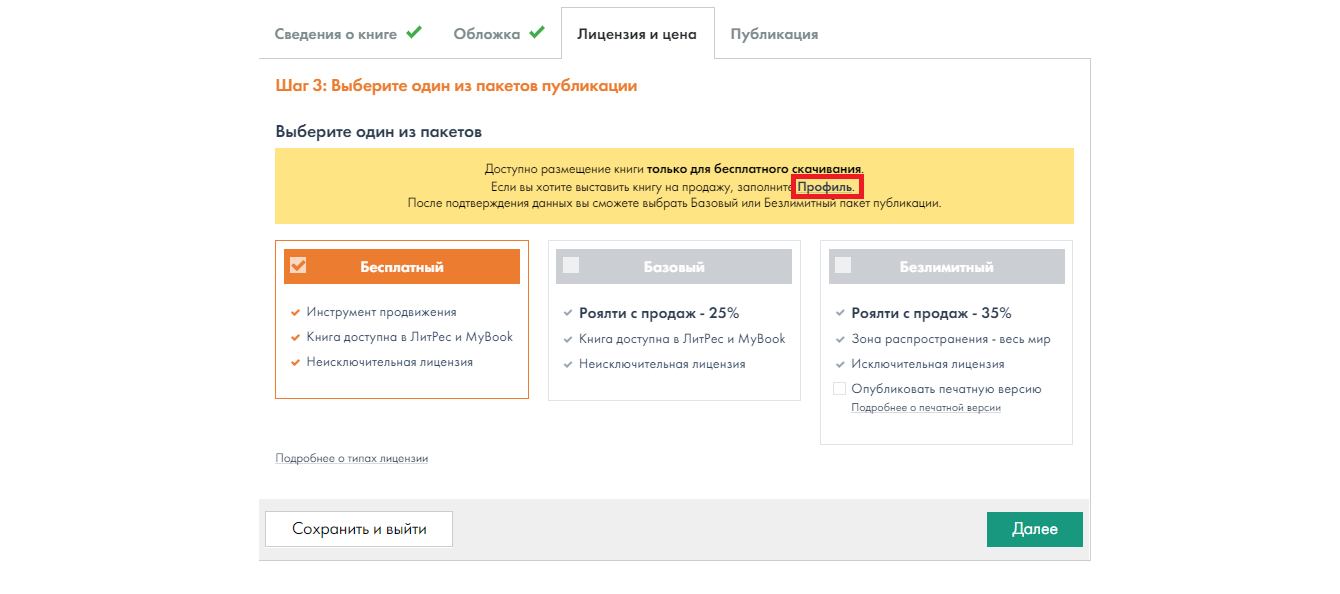 Если все данные уже заполнены, выбирайте пакет, который вам больше подходит. Принципиальное отличие пакетов «Базовый» и «Безлимитный» не только в проценте роялти, но и в условиях лицензии. На тарифе «Базовый» все права на книгу сохраняются у вас, то есть вы сможете параллельно издавать ее на другой площадке. На тарифе «Безлимитный» права на распространение книги перейдет издателю. Кроме того, появится возможность продавать печатный вариант книги по технологии «печать по требованию». В любом случае, услуги по публикации книги автором не оплачиваются ни в одном пакете.