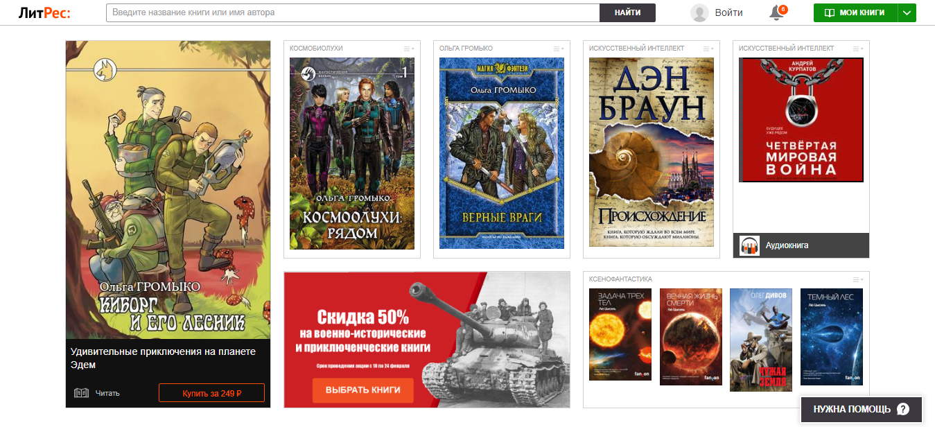 «ЛитРес» — крупнейших магазин электронных книг в России. Здесь можно найти как издания всемирно известных авторов, так и первые произведения новичков в сфере литературы. Ресурс не делит на «хороших» и «плохих», а позволяет читателю самому сделать выбор. Закрома Litres.ru насчитывают более 1 миллиона электронных книг и более 28 тысяч аудиокниг. Все произведения лицензированы и после покупки автору начисляется гонорар. Каждый месяц сайт посещает более 12 миллионов пользователей.