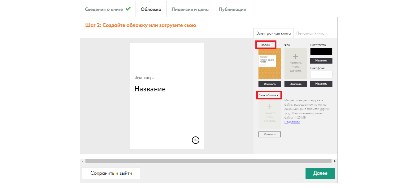 Переходим к редактированию обложки. Вы можете загрузить уже готовую уникальную обложку, если она у вас есть, или воспользоваться шаблоном, вписав свое название книги и имя автора.