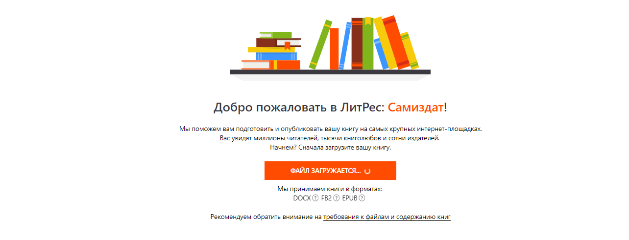 Шаг 4. Теперь нам нужно загрузить файл с книгой в систему. Вы же уже подготовили его? Это может быть вордовский документ, также подходит формат FB2 и EPUB. Чтобы выбрать документ, нажимаем на кнопку «Загрузить файл».