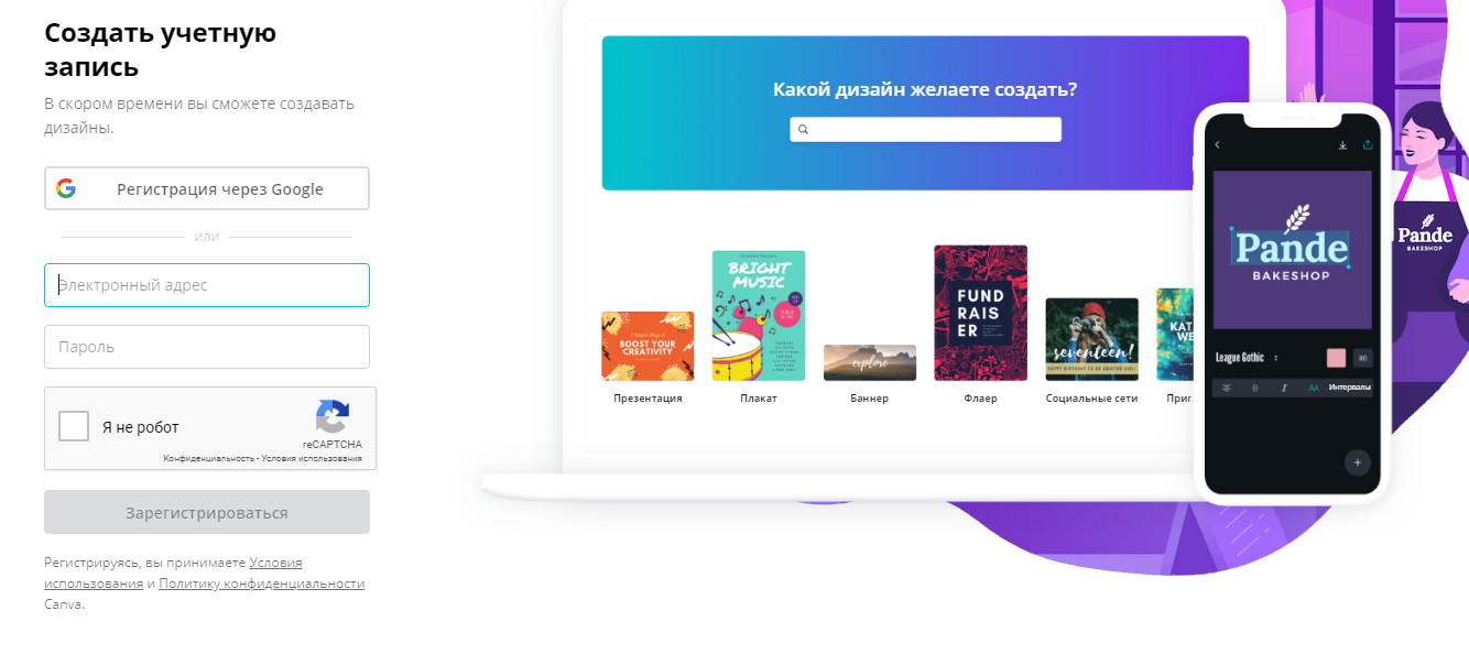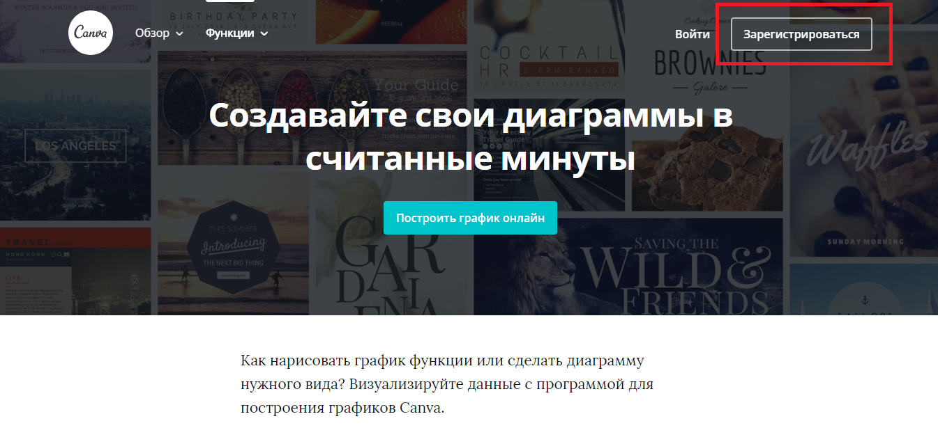 Шаг 1. Заходим на сайт https://www.canva.com/ru_ru/grafiki/ и нажимаем на кнопку «Зарегистрироваться».
