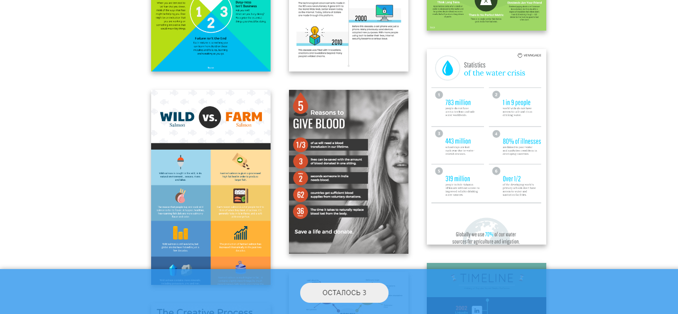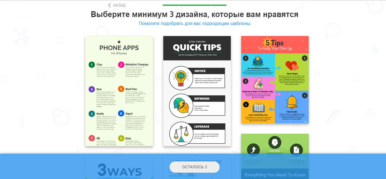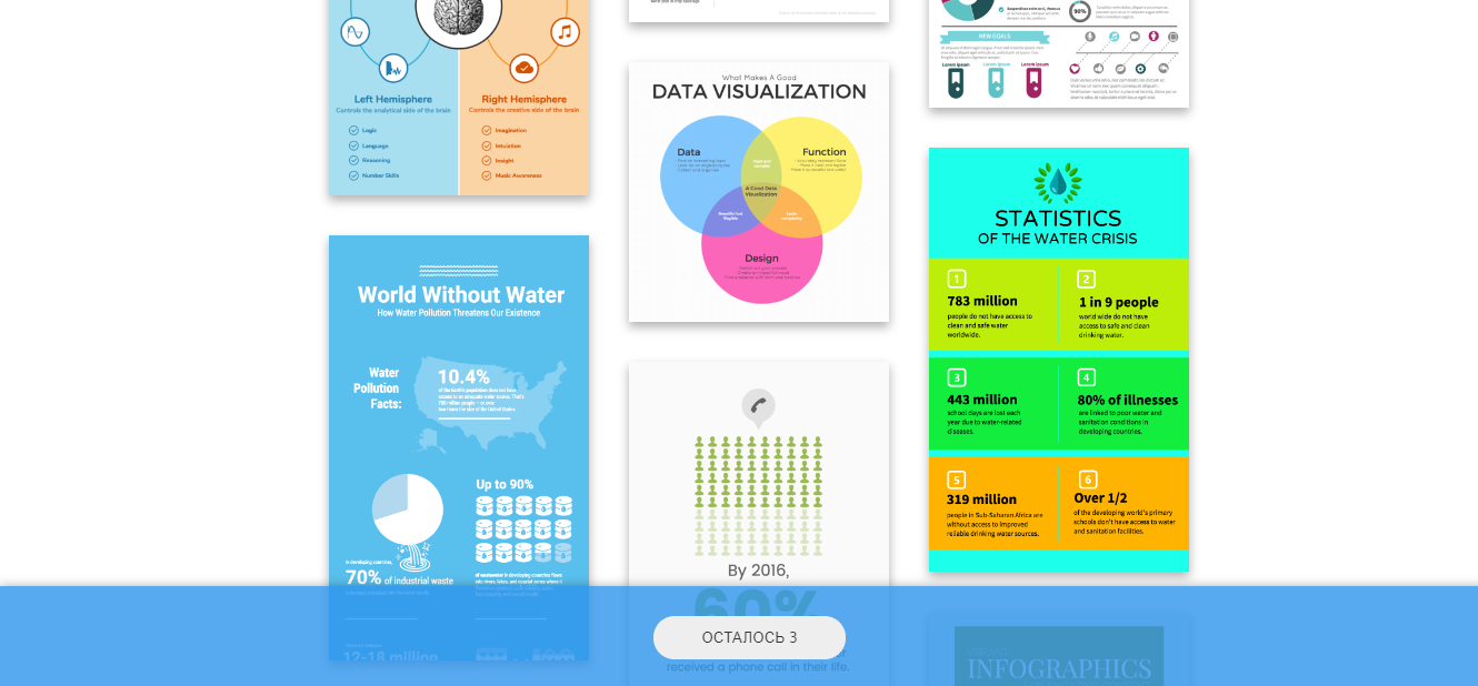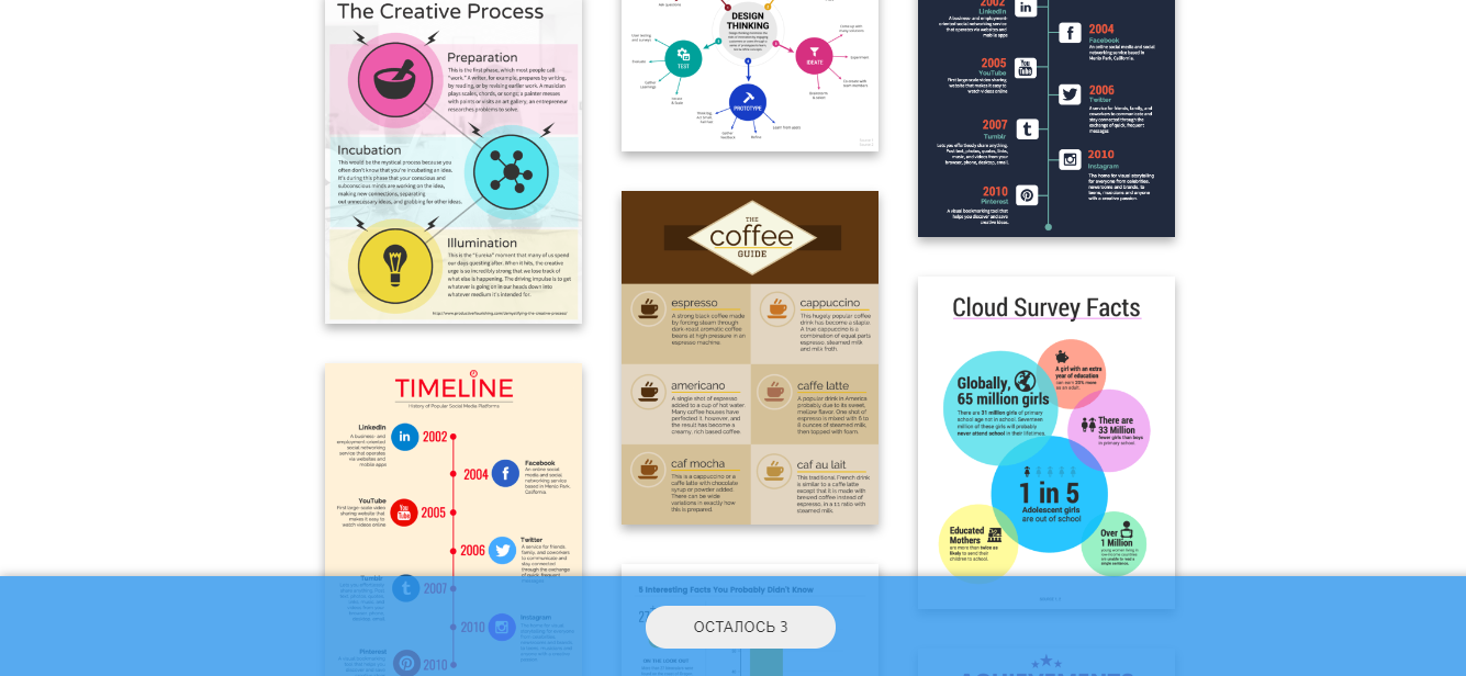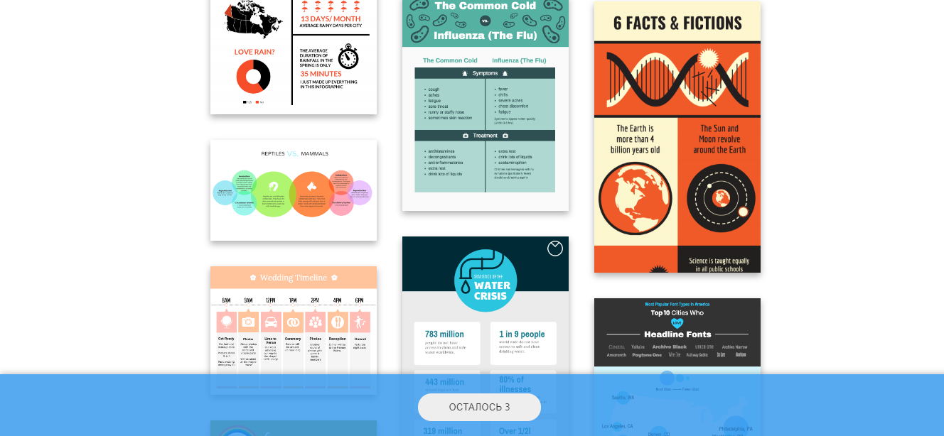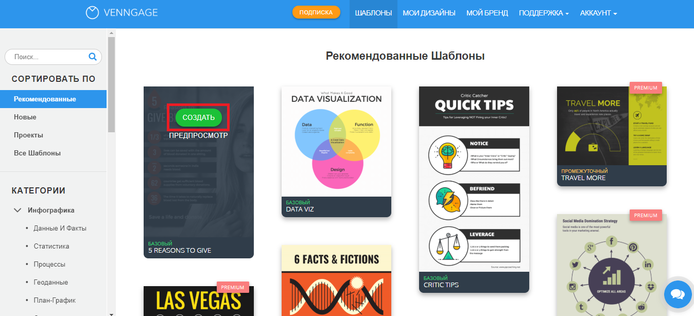 Шаг 3. Теперь мы в своем рабочем аккаунте и можем приступить к созданию первой инфографики. Для этого наводим курсив на понравившийся шаблон и нажимаем на кнопку «Создать».