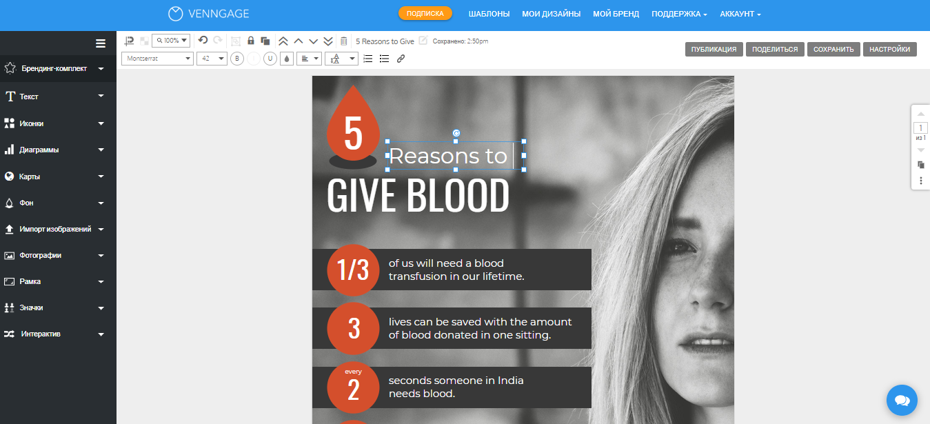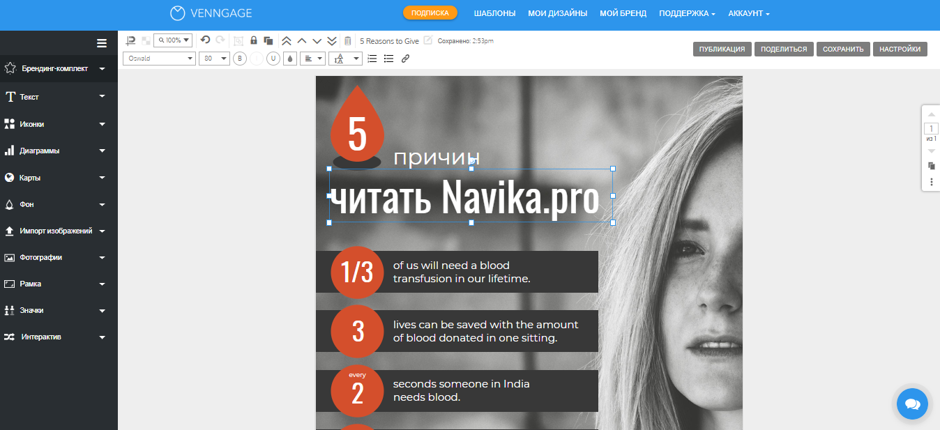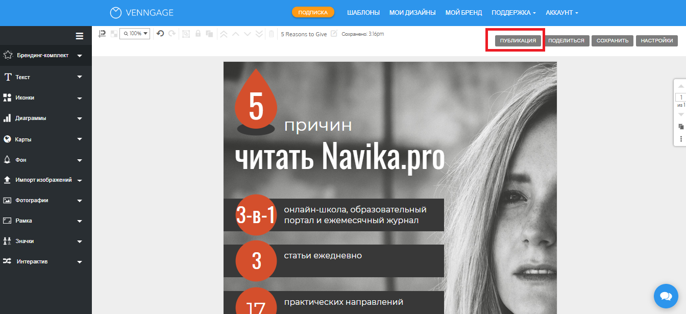 Шаг 4. Теперь необходимо опубликовать готовую инфографику. Для этого нажимаем на кнопку «Публикация» в правом верхнем углу.