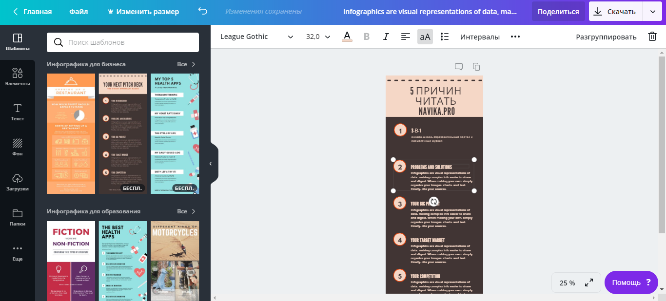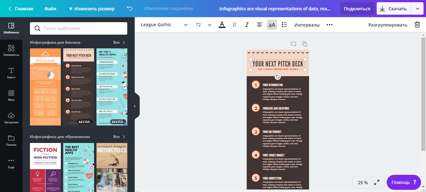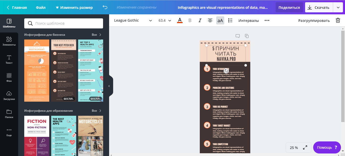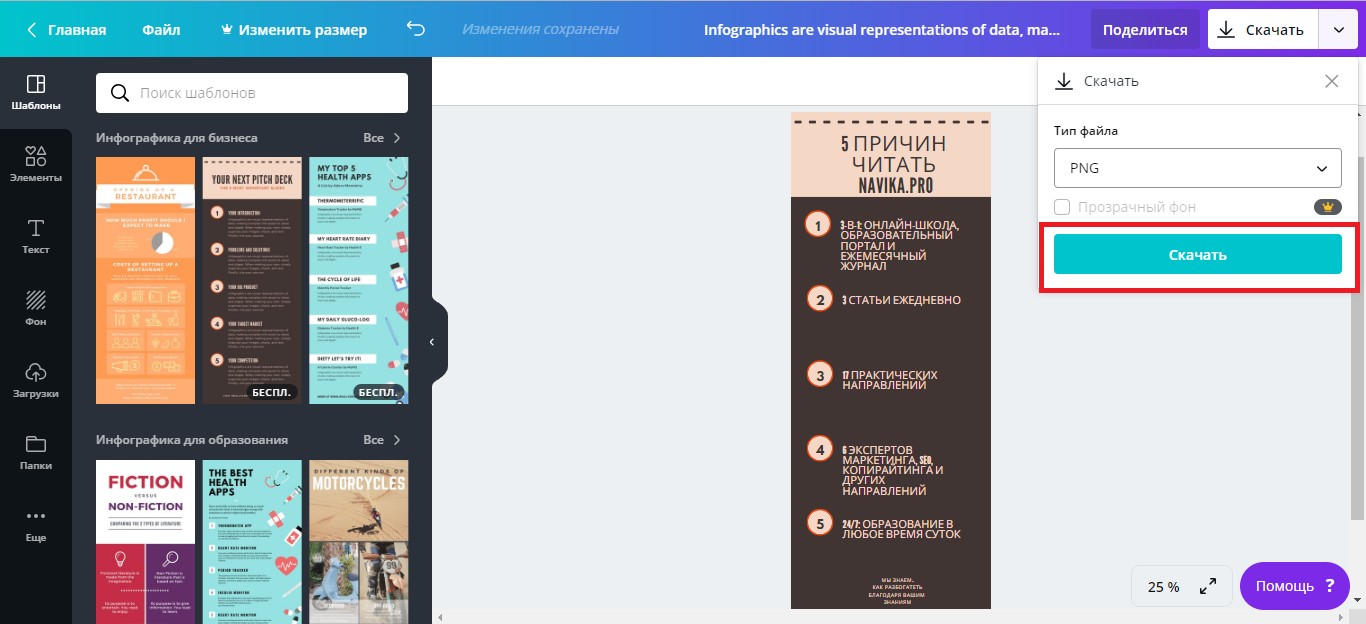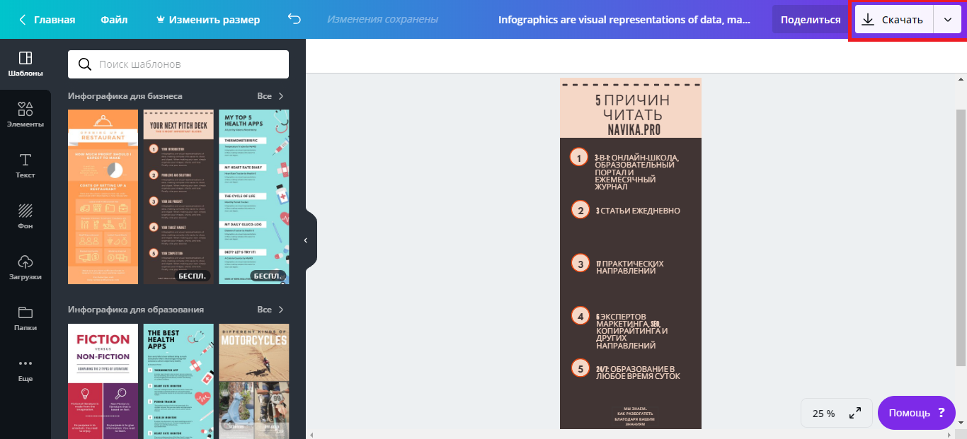 Шаг 4. Поздравляем, ваша инфографика готова! Теперь осталось только ее скачать. Да, здесь это возможно без лишних танцев с бубнами. Просто нажимаем на кнопку «Скачать» в правом верхнем углу.