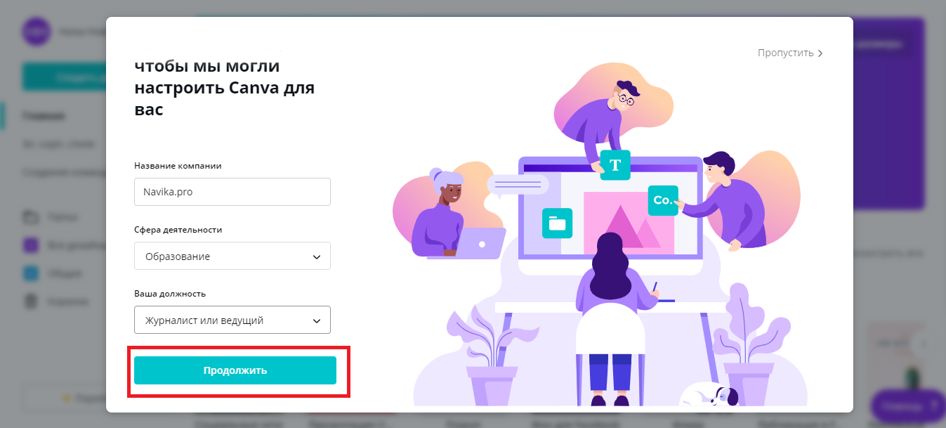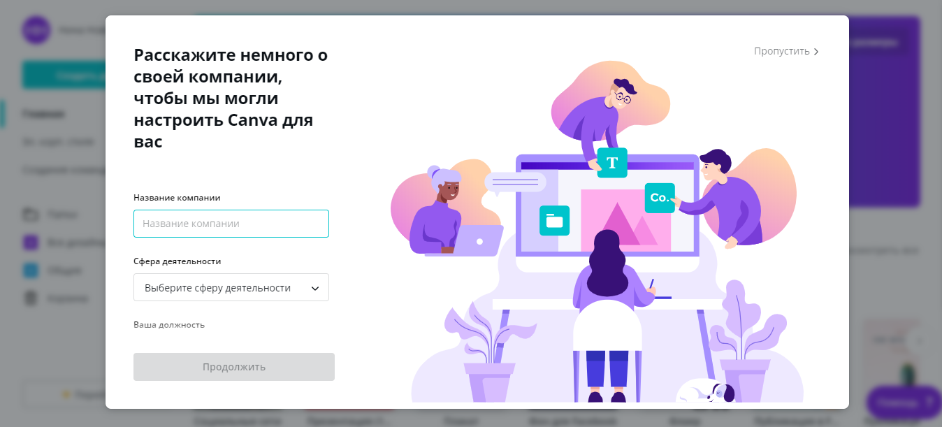 Шаг 2. Заполняем свой профиль. Указываем название компании, сферу деятельности и должность. Нажимаем на кнопку «Продолжить».