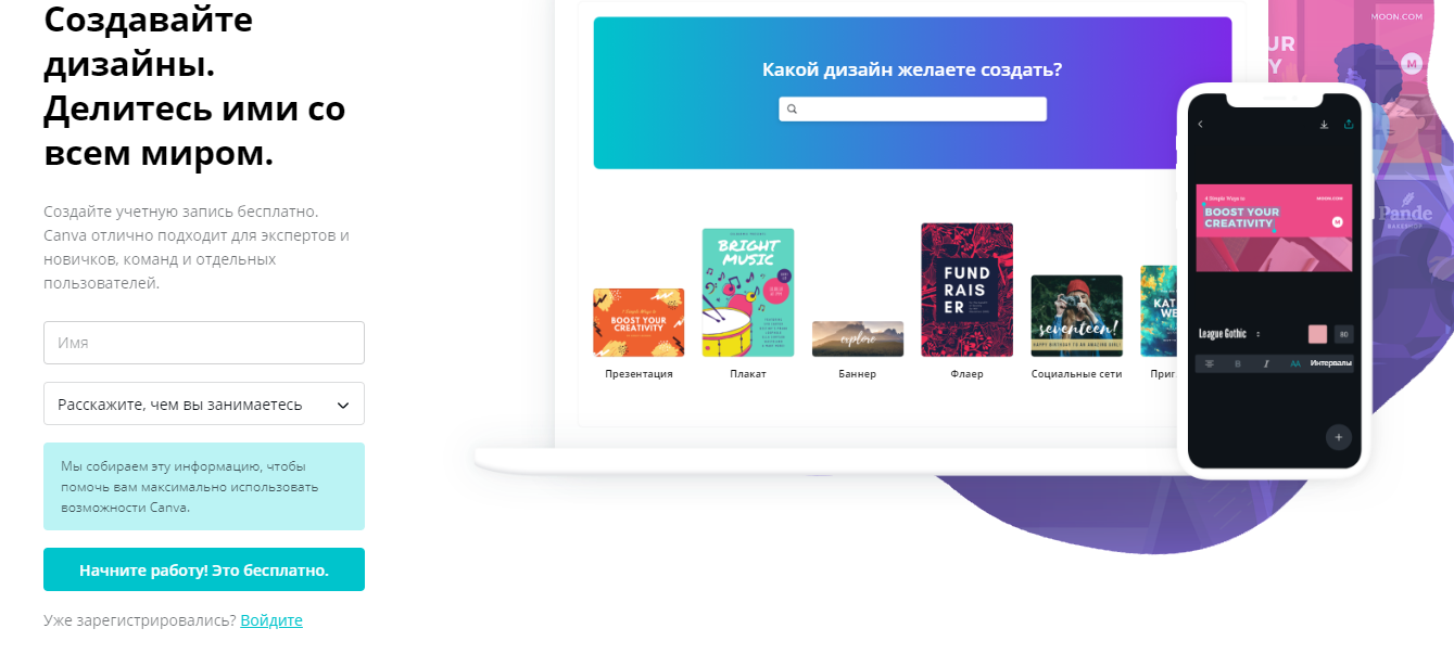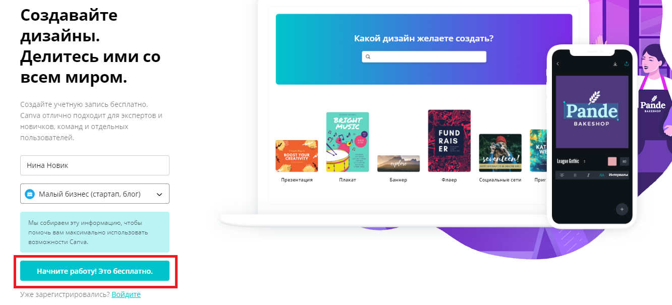 В новом окне вводим имя, род деятельности и нажимаем на кнопку «Начните работу! Это бесплатно».