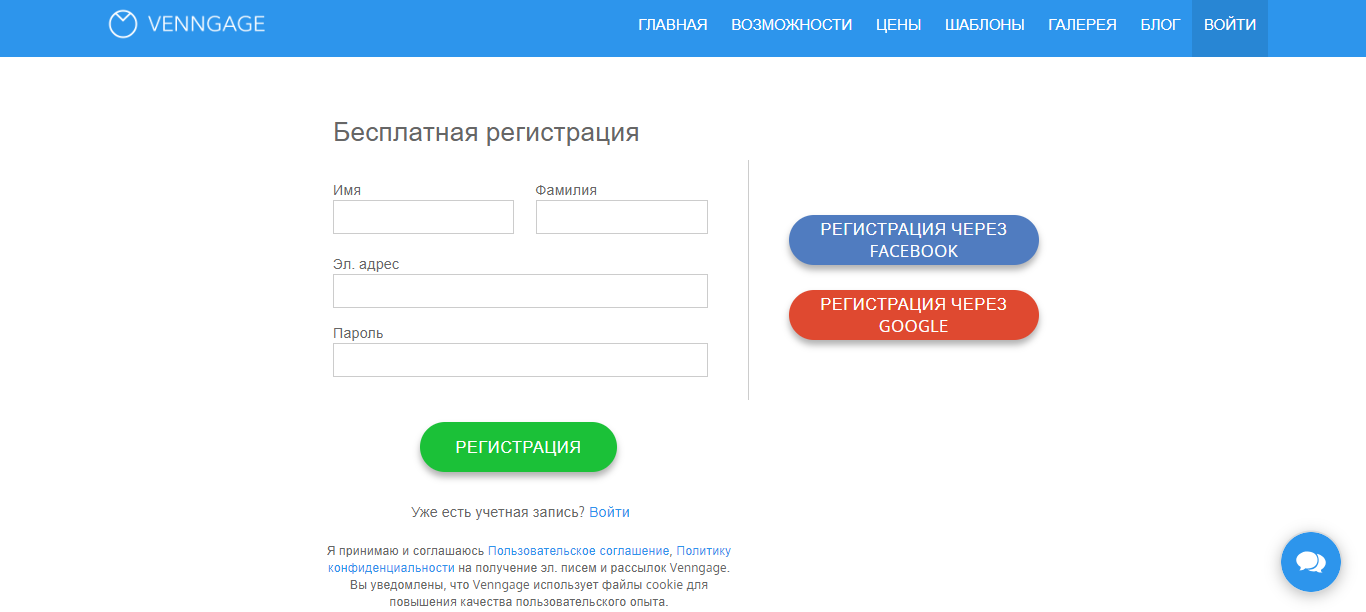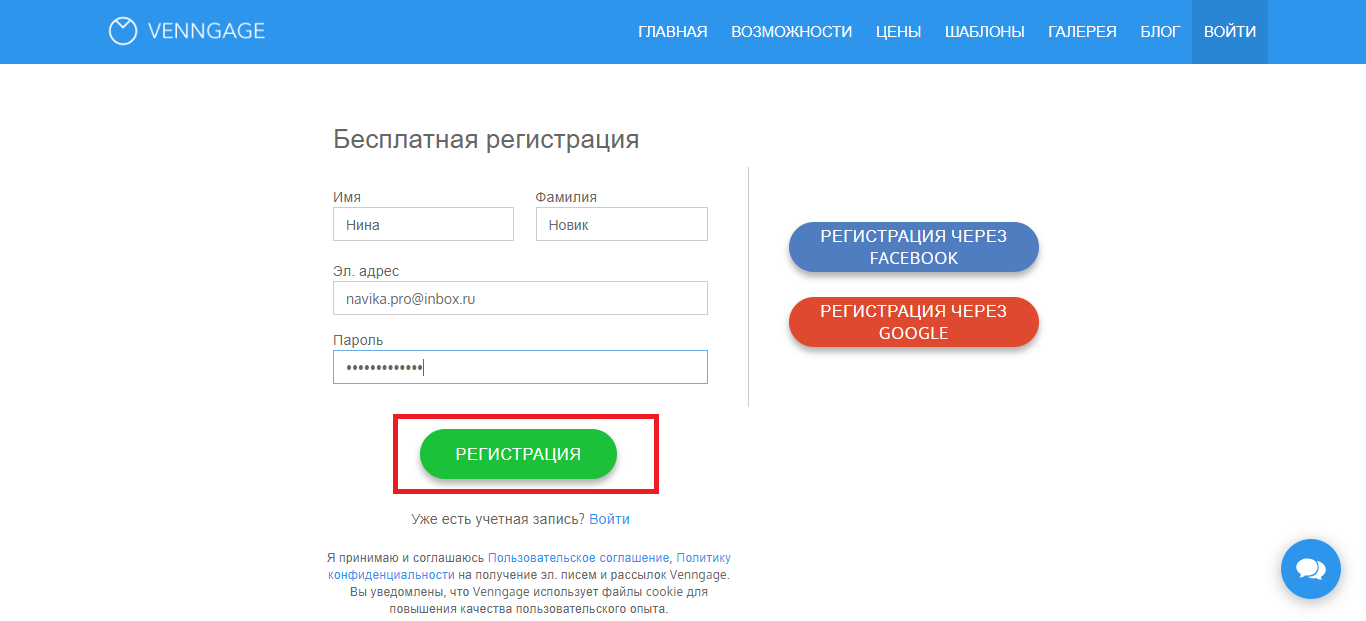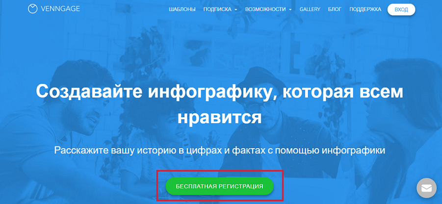 Шаг 1. Заходим на сайт https://ru.venngage.com/ и нажимаем на кнопку «Бесплатная регистрация».