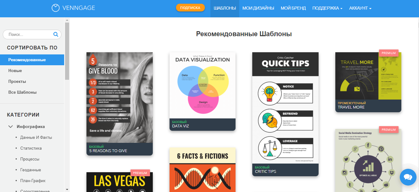 Venngage — бесплатный конструктор, который помогает создать инфографику в три простых шага после регистрации. Среди функций более 100 шаблонов, а также возможность создать свою уникальную картинку. Помимо инфографики, здесь можно сделать постер, резюме, отчет, приглашение и другие виды визуальной подачи информации.