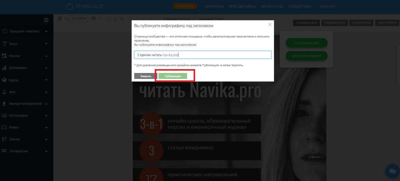 Вводим название инфографики и нажимаем на кнопку «Публикация».