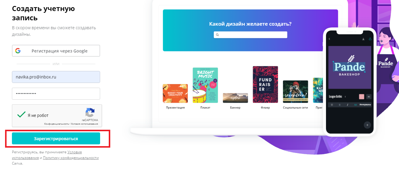 Дальше вводим адрес электронной почты, пароль, подтверждаем, что мы не роботы, и нажимаем на кнопку «Зарегистрироваться».