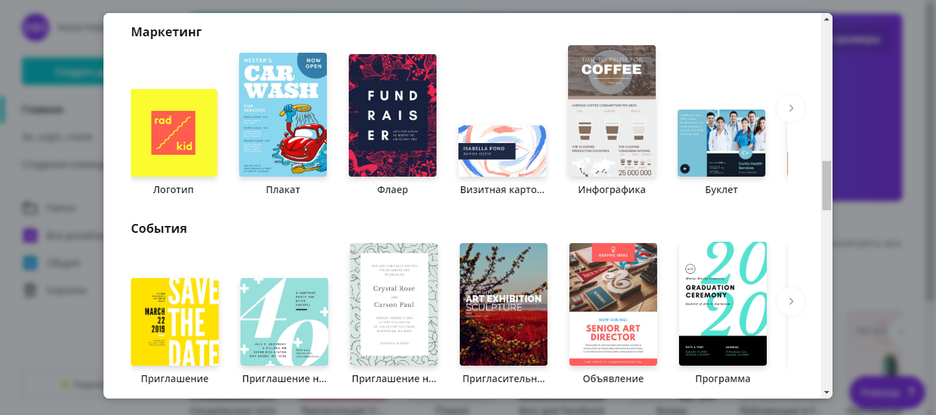 Шаг 3. Выбираем дизайн для своей будущей картинки из предложенных шаблонов. В данном случае нас интересует инфографика, именно ее и ищем в списке.