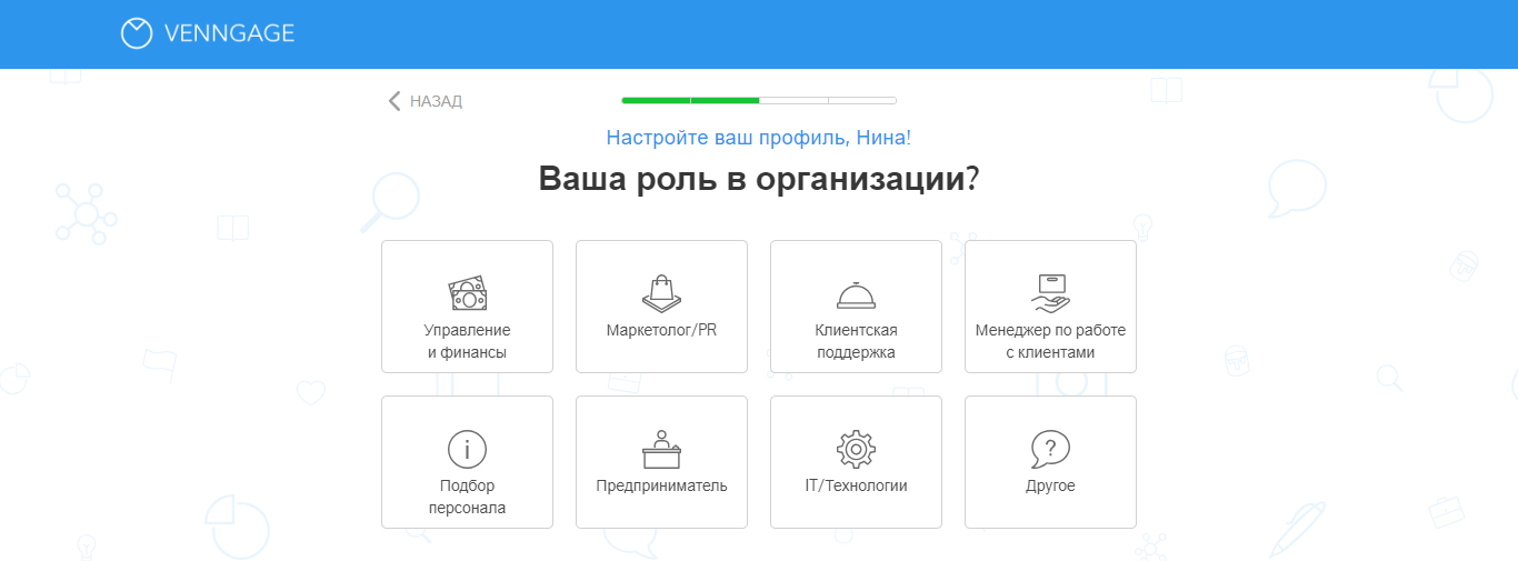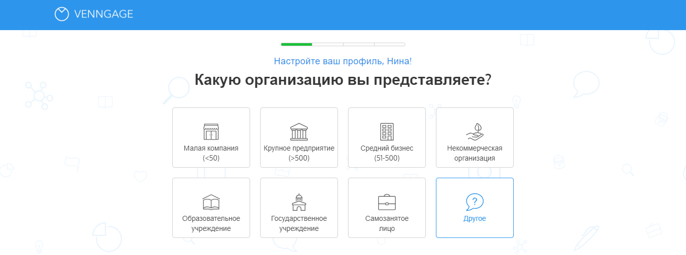 Шаг 2. Теперь нужно настроить свой профиль. А для этого ответить на несколько вопросов. Отмечаем, какую организацию представляем.
