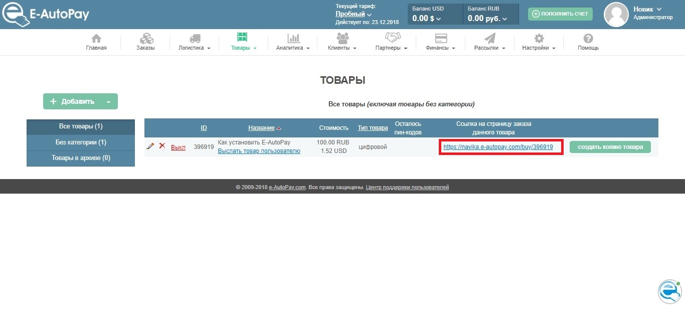 Теперь в списке товаров у нас отобразился первый продукт. И так как он цифровой, для него создана автоматическая ссылка для скачивания после покупки.