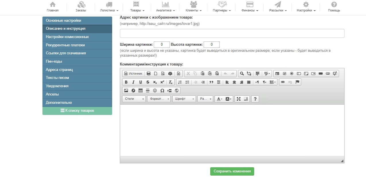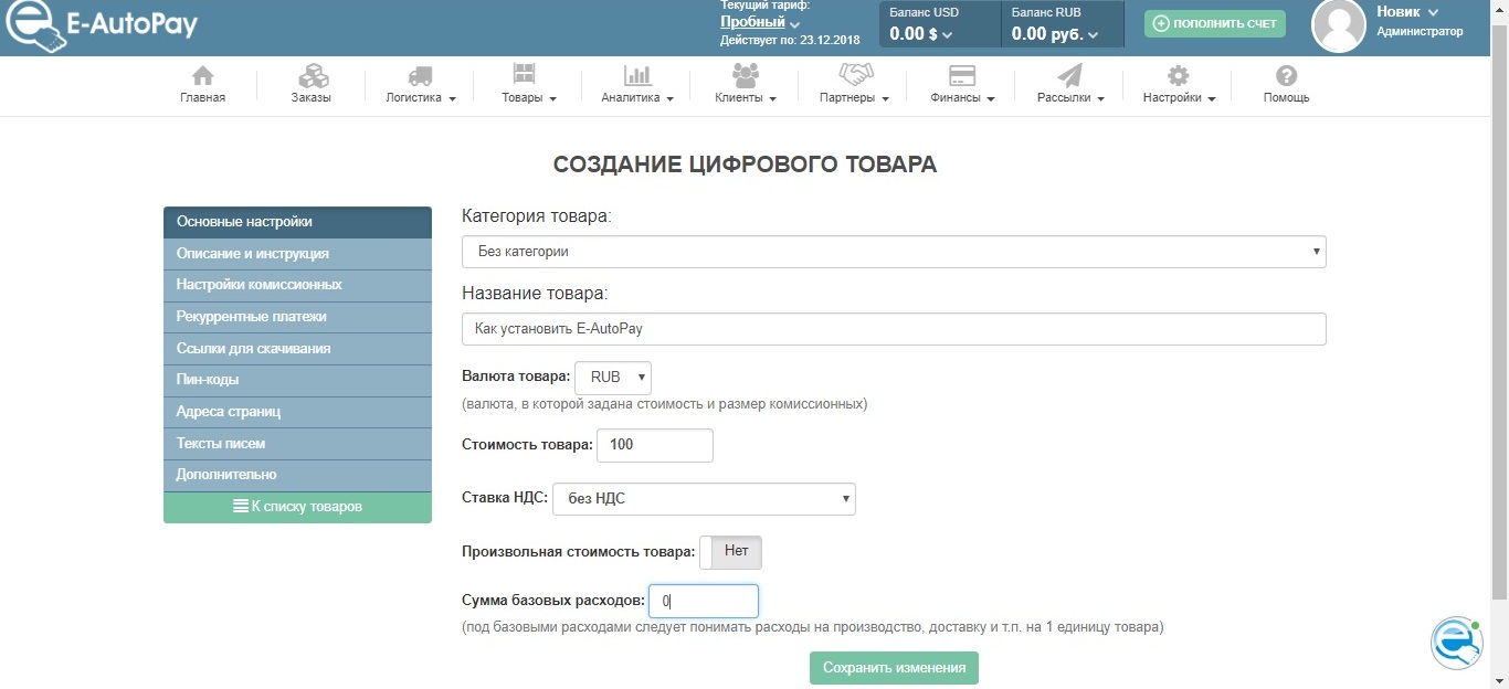 Для добавления, например, цифрового товара необходимо ввести его основные данные: категория (если вы уже создали свои категории), название, валюта, в которой задана стоимость, стоимость товара, ставка НДС (если есть), сумма базовых расходов (производство товара, его доставка и др.). Также здесь можно выбрать параметр «Произвольная стоимость товара». Это значит, что покупатель сможет сам указать ту сумму, за которую он хочет купить ваш продукт. После заполнения карточки товара нажимаем на кнопку «Сохранить изменения».
