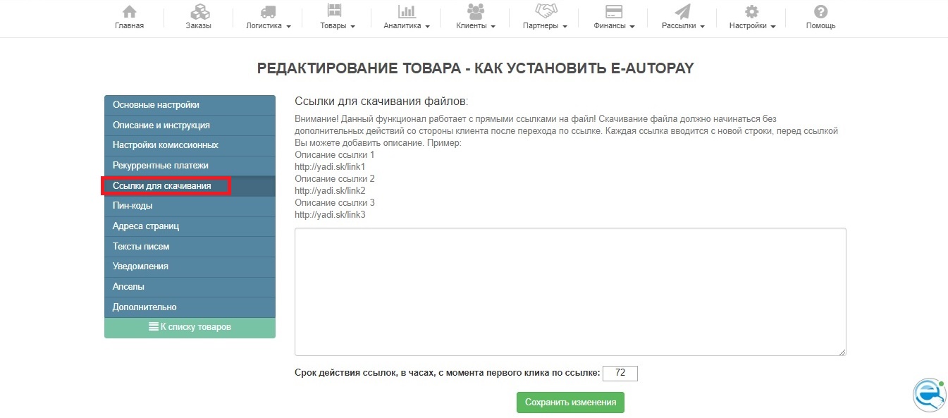 Шаг 15. Если ваш товар хранится в облаке, то во вкладке «Ссылки для скачивания» необходимо указать прямую ссылку на файл, чтобы покупатель мог скачать его в один клик. Здесь также необходимо указать время действия ссылки с первого скачивания — по умолчанию это 72 часа. После заполнения нажимаем на кнопку «Сохранить изменения».