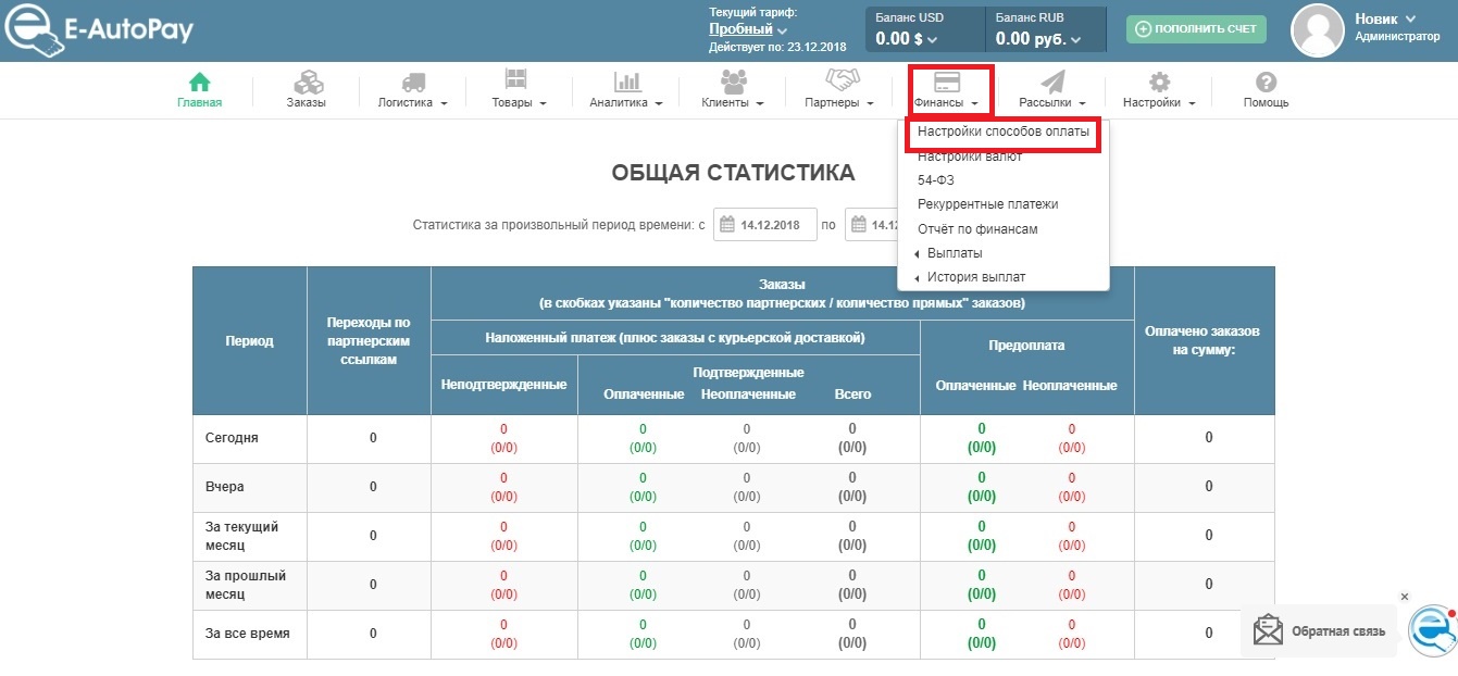 Начнем с настройки платежей и добавим способы оплаты. Стоит сказать, что сам сервис E-AutoPay не принимает никаких денег. Оплата происходит посредством интеграции с платежными системами. Для настройки нажимаем на вкладку «Финансы» и выбираем пункт «Настройки способов оплаты».