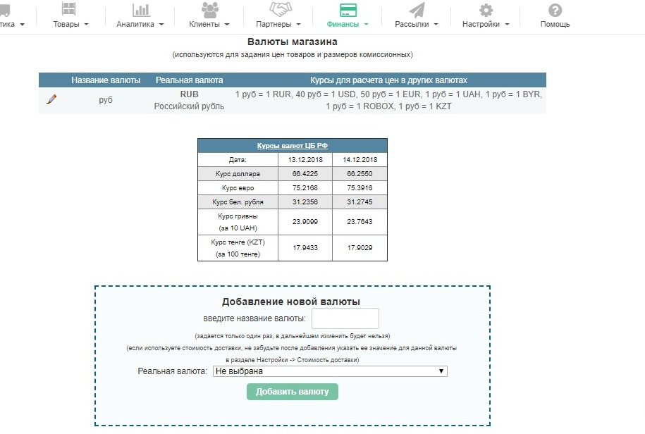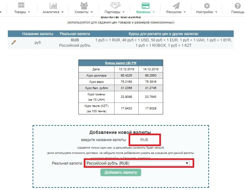 Шаг 10. Теперь нужно выбрать валюту, в которой вы хотите принимать платежи. Для этого на вкладке «Финансы» выбираем пункт «Настройки валют» либо переходим на страницу через левое боковое меню.