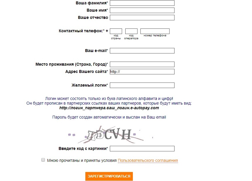 Обратите внимание на два важных момента. Первое: почта должна быть реальной, потому что на нее придет информация с вашим логином и паролем для входа. Второе: логин для входа в систему E-AutoPay вы сможете потом изменить, но логин, который вы выбираете при регистрации в поле «Желаемый логин», будет указываться в ссылках партнерских программ и изменить его потом будет нельзя.