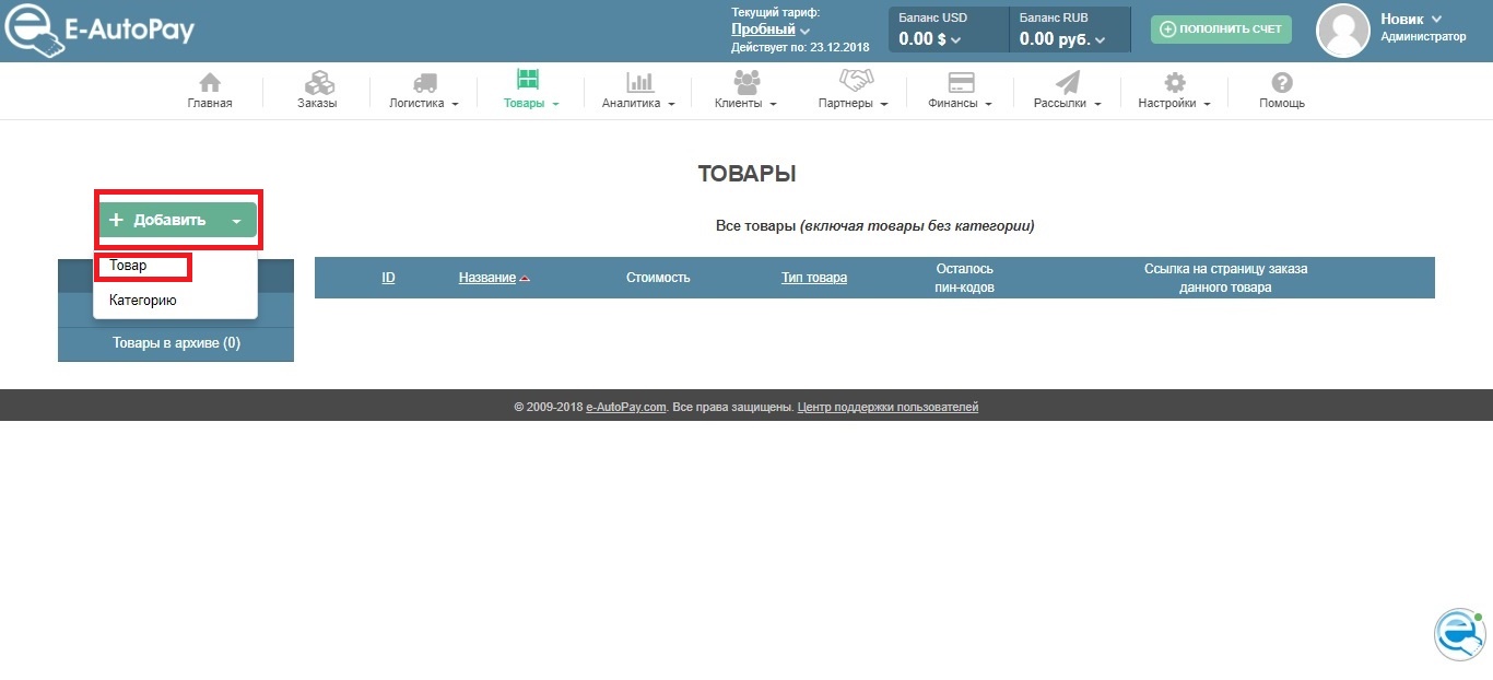 Пока наш список товаров пуст. Нажимаем на кнопку «Добавить» и выбираем вкладку «Товар».