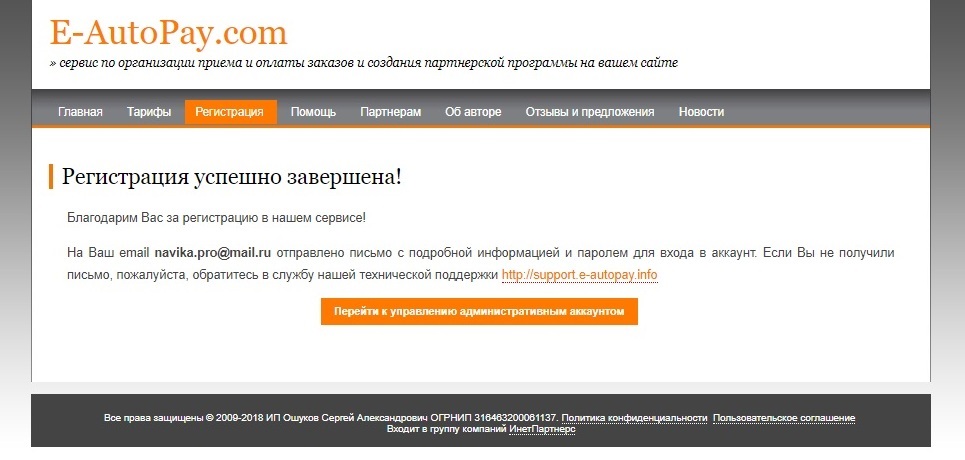 E-AutoPay — это сервис, который помогает автоматизировать ваш бизнес. Через данную систему каждый (даже незарегистрированный) предприниматель может организовать на своем сайте прием и оплату заказов, а также создать партнерские программы. Чтобы автоматизировать все процессы, не нужно что-то скачивать, устанавливать специальную программу и постоянно проверять обновления. Достаточно зарегистрироваться в системе на сайте www.e-autopay.com и в принципе забыть про внутреннюю «кухню» сервиса, что значительно упрощает жизнь инфобизнесменам и интернет-предпринимателям.