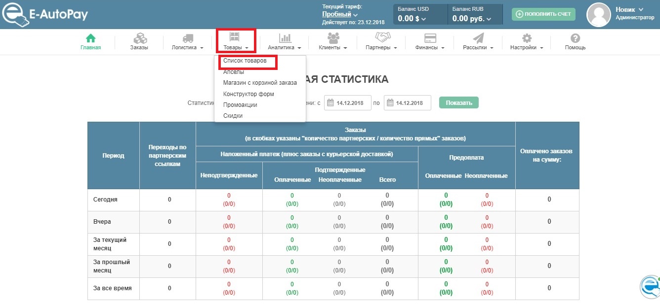 Шаг 13. Дальше нужно добавить в систему товары, цифровые или физические. Для этого на вкладке «Товары» выбираем пункт «Список товаров».