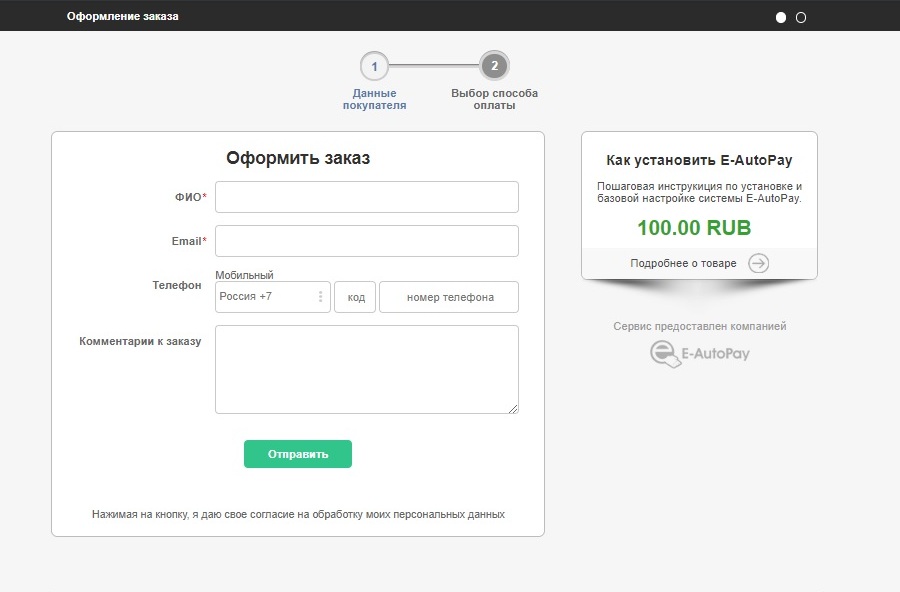 При оформлении заказа у клиента появится форма, где необходимо ввести свои данные и выбрать способ оплаты. После проверки оплаты ему будет выслана на e-mail ссылка для скачивания цифровой покупки.