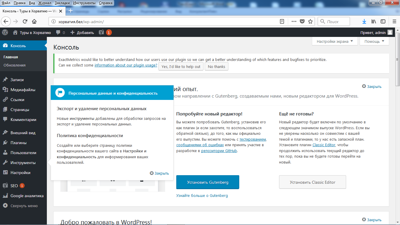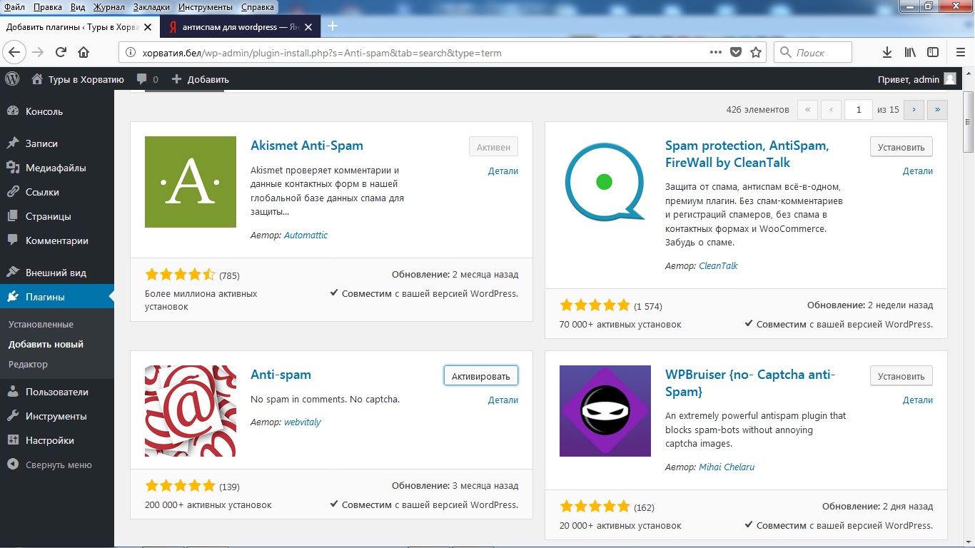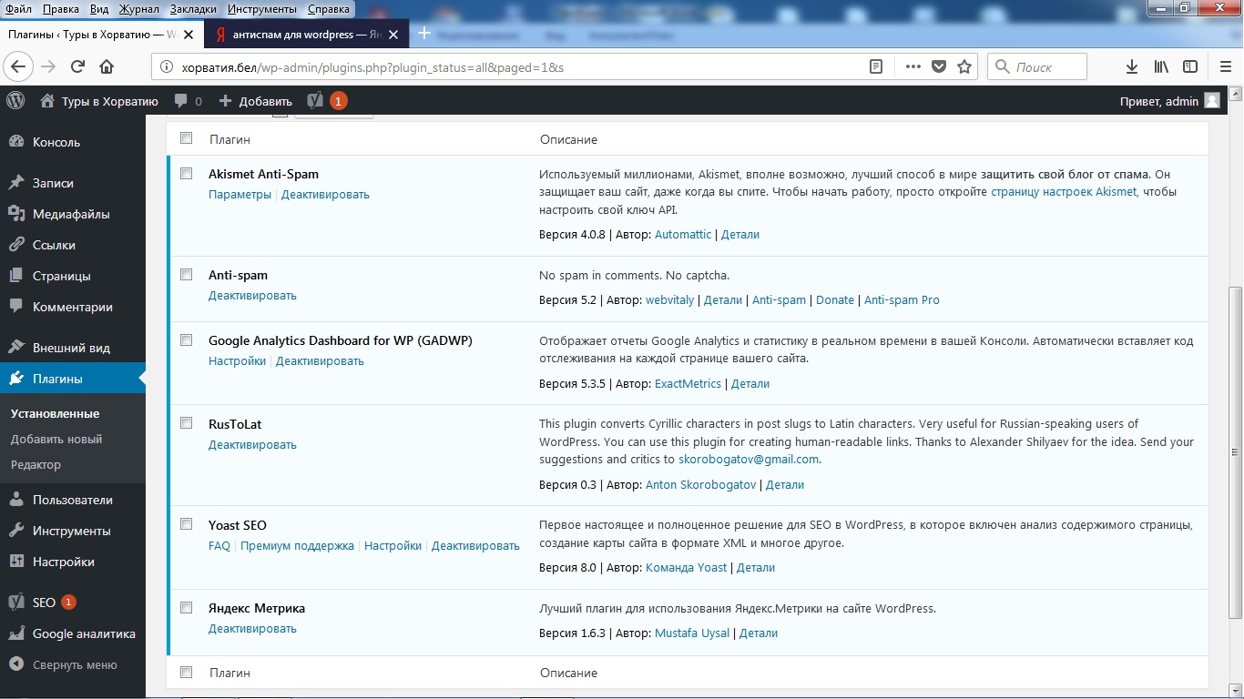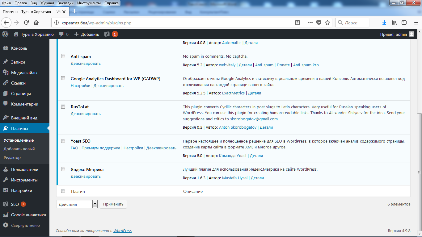 В процессе дальнейшей работы с сайтом эту операцию нужно повторять по мере надобности, обновлять и саму версию WordPress, и установленные плагины.