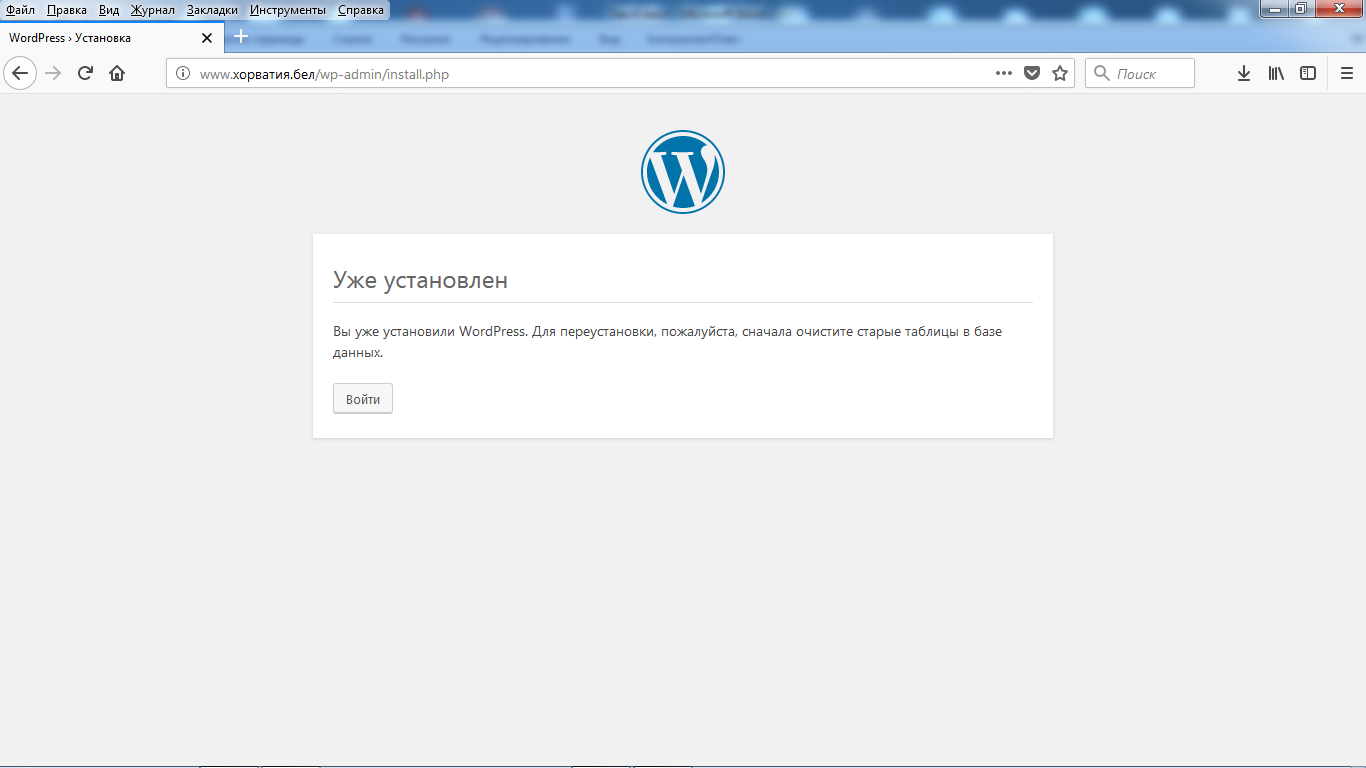 Если WordPress на вашем сайте уже установлен, то при вводе http://адрессайта/wp-admin/install.php появится вот такое окно: