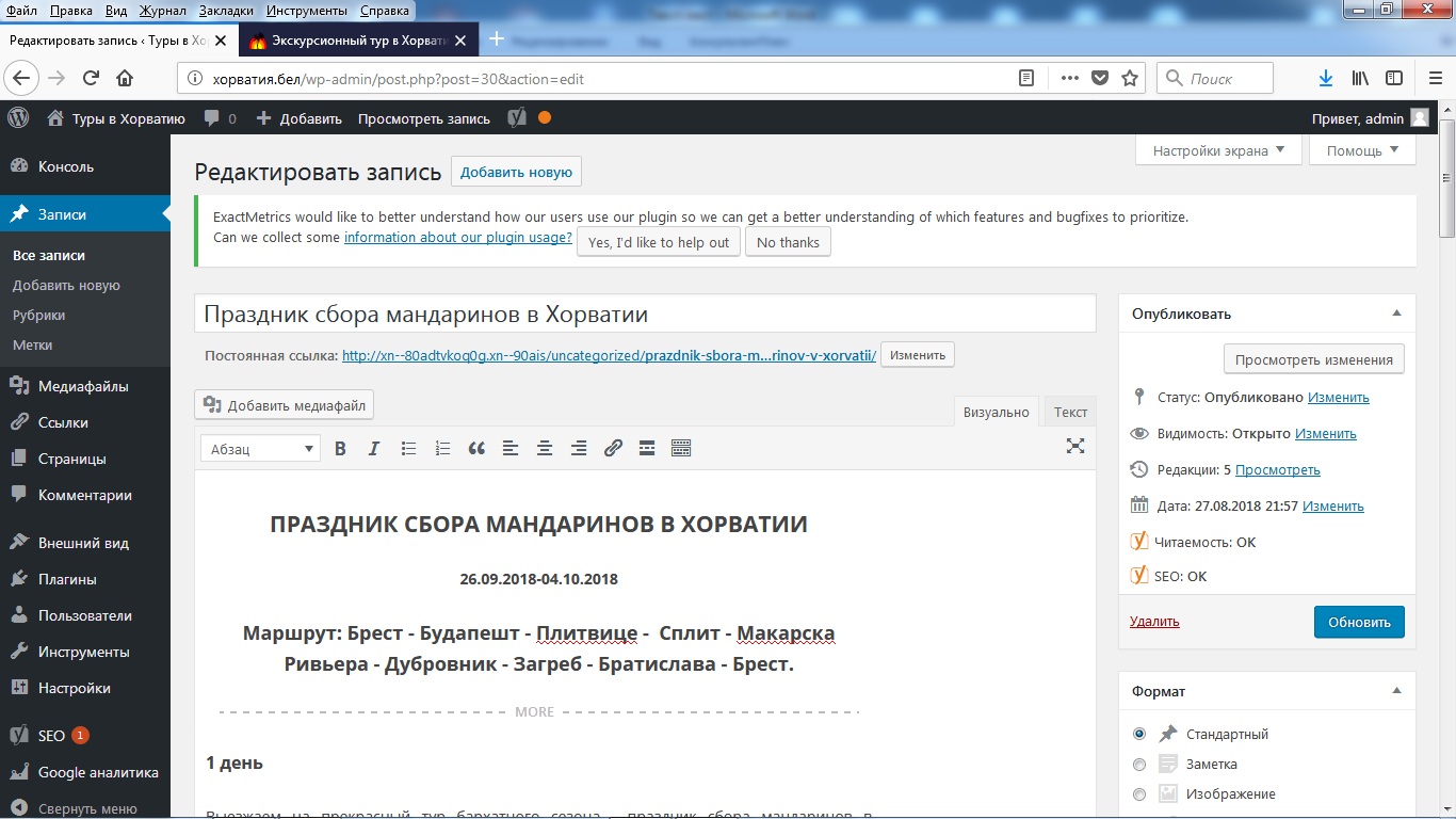 Чем лучше вы отформатировали текст, тем удобнее посетителю сайта будет его читать. Справа вы видите оценку читаемости текста — ее дает плагин Yoast of SEO.