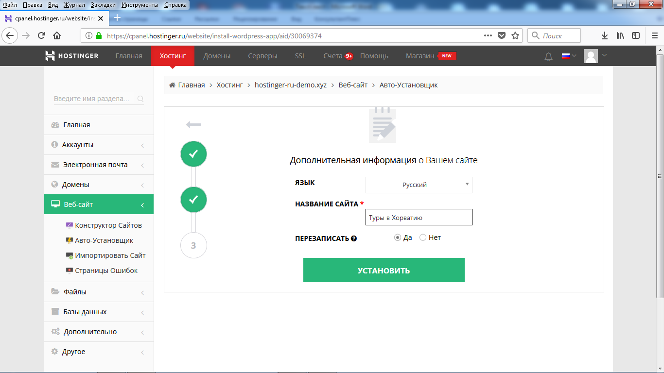 Е. Введите язык сайта и его название. Нажмите кнопку «Установить».