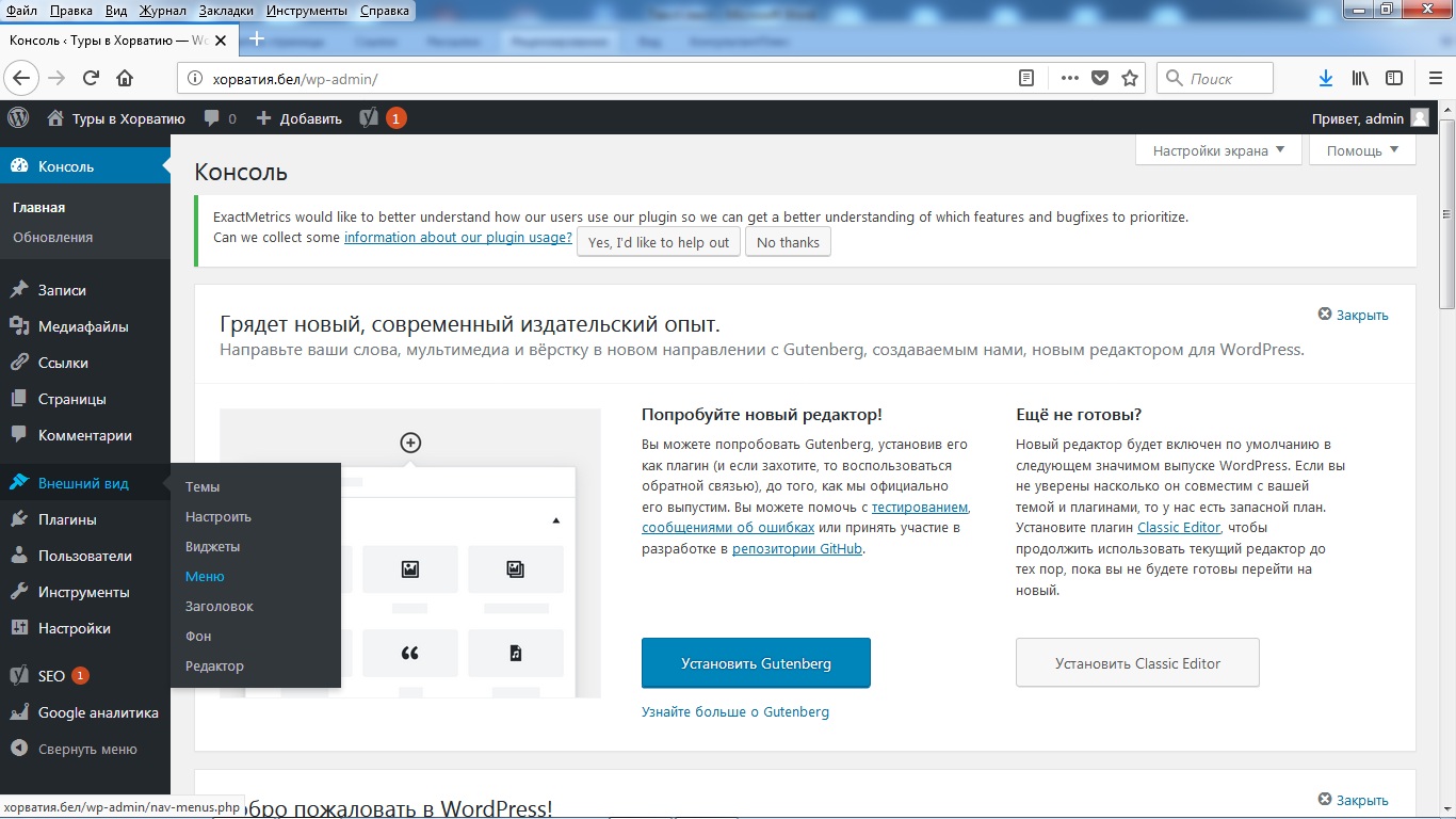 Вам нужно войти в панель управления сайтом. Для этого откройте браузер и наберите в командной строке: www.адрессайта.ru/wp-login.php.