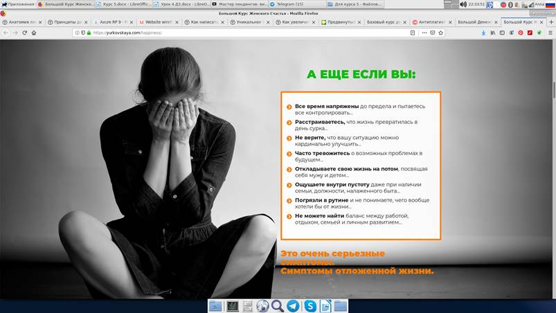 - составьте три-четыре образа, персоны. Например, Оксана, мама в декрете. По профессии бухгалтер, но не хочет выходить в офис на прежнее место работы. Цель: хочет найти дело по душе и приносящее доход, не выходя из дома. Трудности: ограниченный бюджет на обучение, мало времени на учебу (2–3 часа в день во время сна ребенка). Наше решение: обозначаем на лендинге, что на курсе можно попробовать несколько удаленных профессий и выбрать свое, при этом в течение дня обучение займет немного времени, и есть разные варианты пакетов, в том числе пакет «Самостоятельный» по очень бюджетной цене;