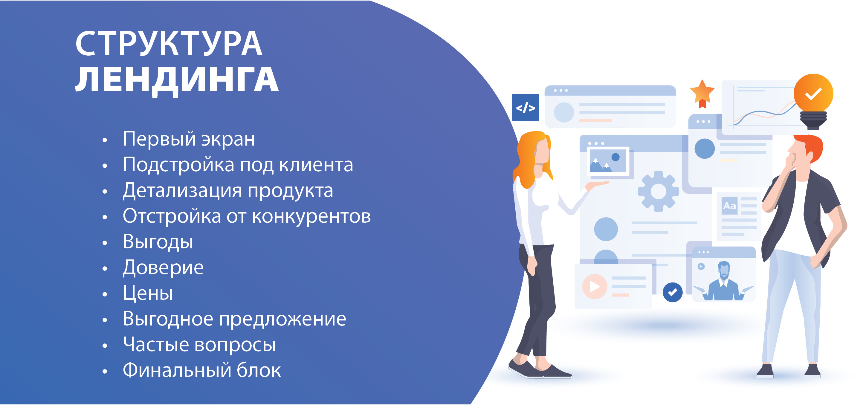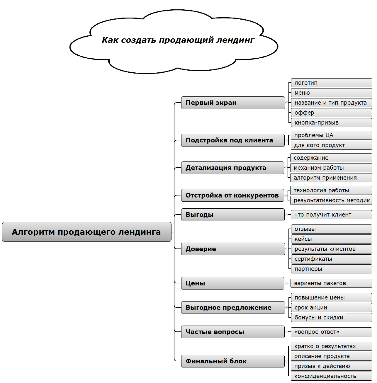Главная задача продающего лендинга — «зацепить» клиента, убедить его в важности покупки вашего продукта, подтолкнуть к решению его проблемы с помощью вашего предложения прямо сейчас. И для того чтобы достичь этих целей максимально эффективно, лендинг строится по определенной блочной структуре, каждый блок которой решает один вопрос и вовлекает читателя прокручивать страницу дальше.