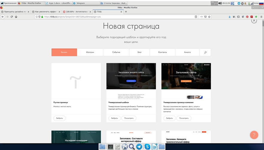 Выбираем одну из шести категорий шаблона: бизнес, магазин, событие, блог, контакты, анкета.