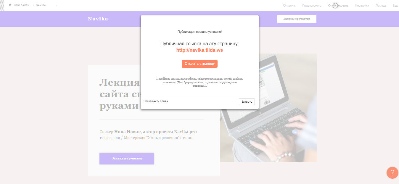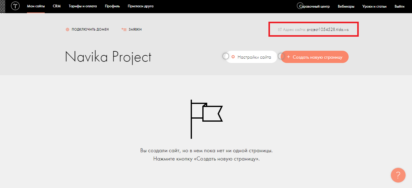 Шаг 4. Поздравляем, ваш сайт создан! Его адрес звучит не совсем приглядно: project1054528.tilda.ws — но это временно и необходимые настройки все исправят.