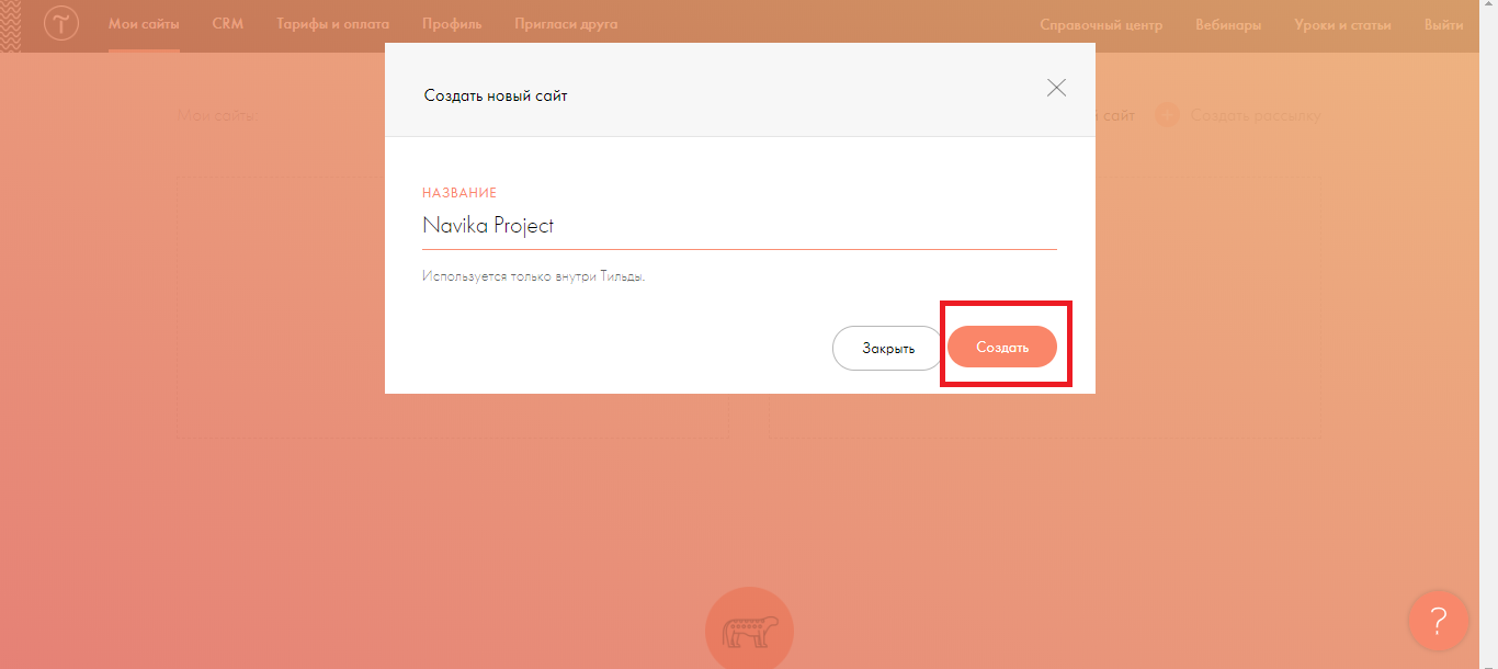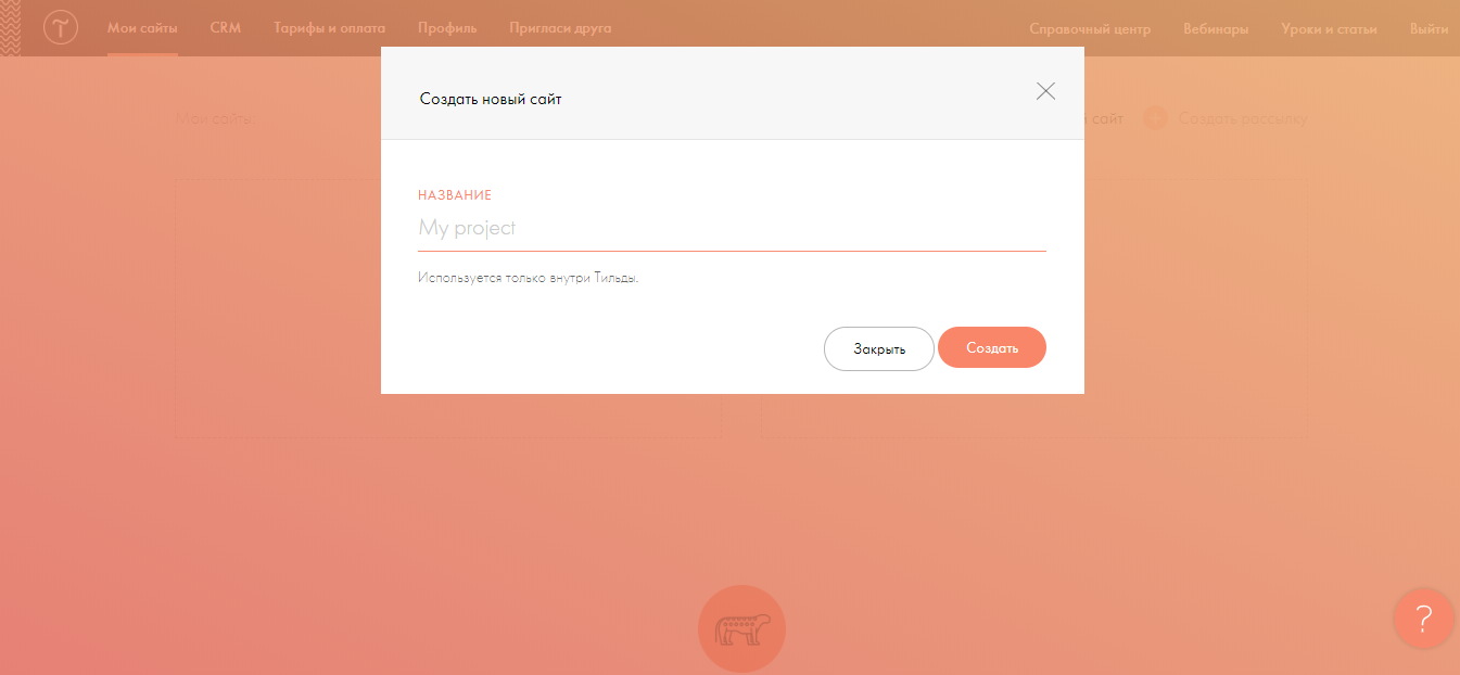 Шаг 3. Нужно придумать название для сайта, которое будет использоваться только внутри Tilda Publishing. Вы можете выбрать по умолчанию «My project» или задать что-то свое.
