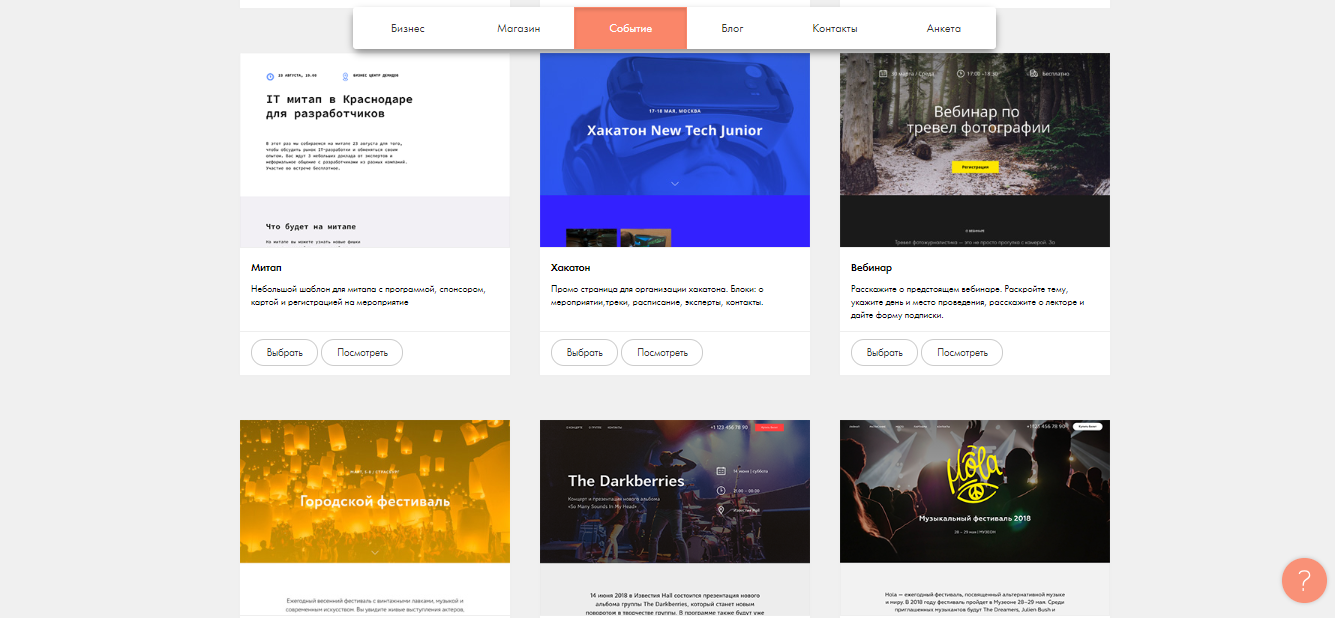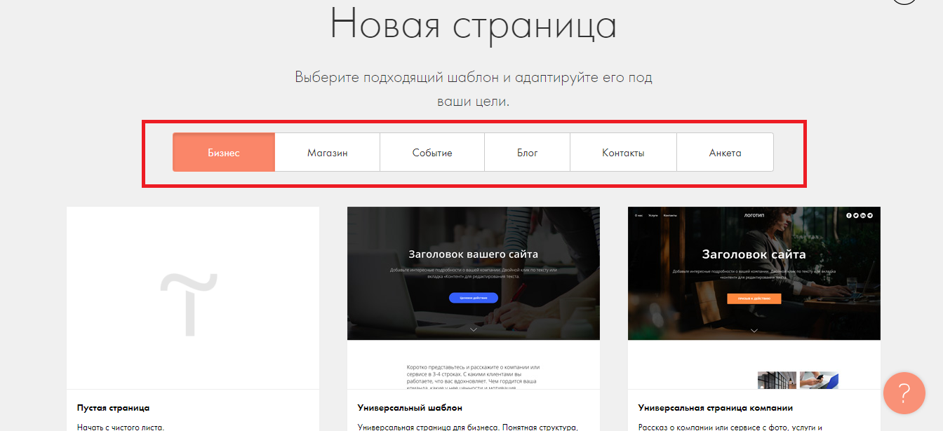 Выбираем одну из шести категорий шаблона: бизнес, магазин, событие, блог, контакты, анкета.