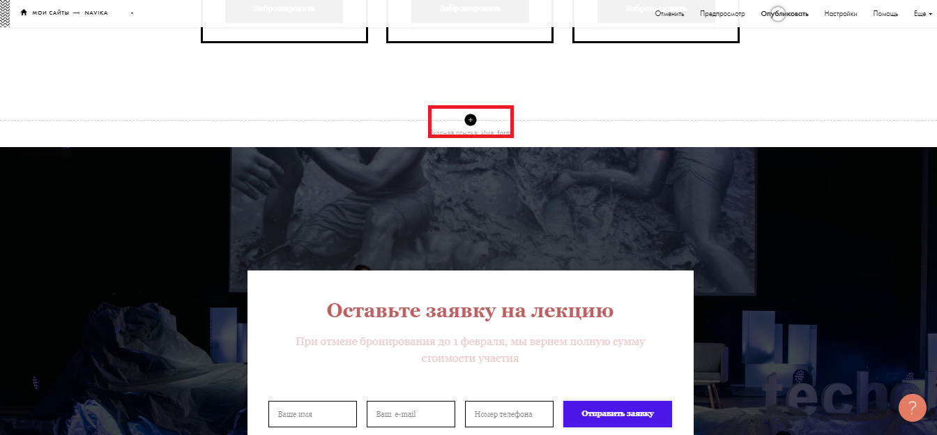 Если в шаблоне нет обходимого вам блока, вы можете добавить его самостоятельно, нажав на «крестик» по центру экрана.