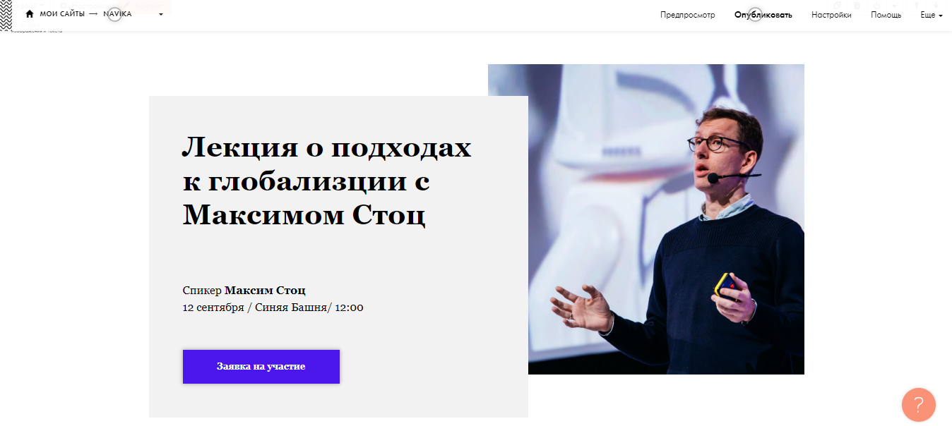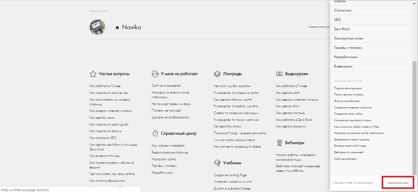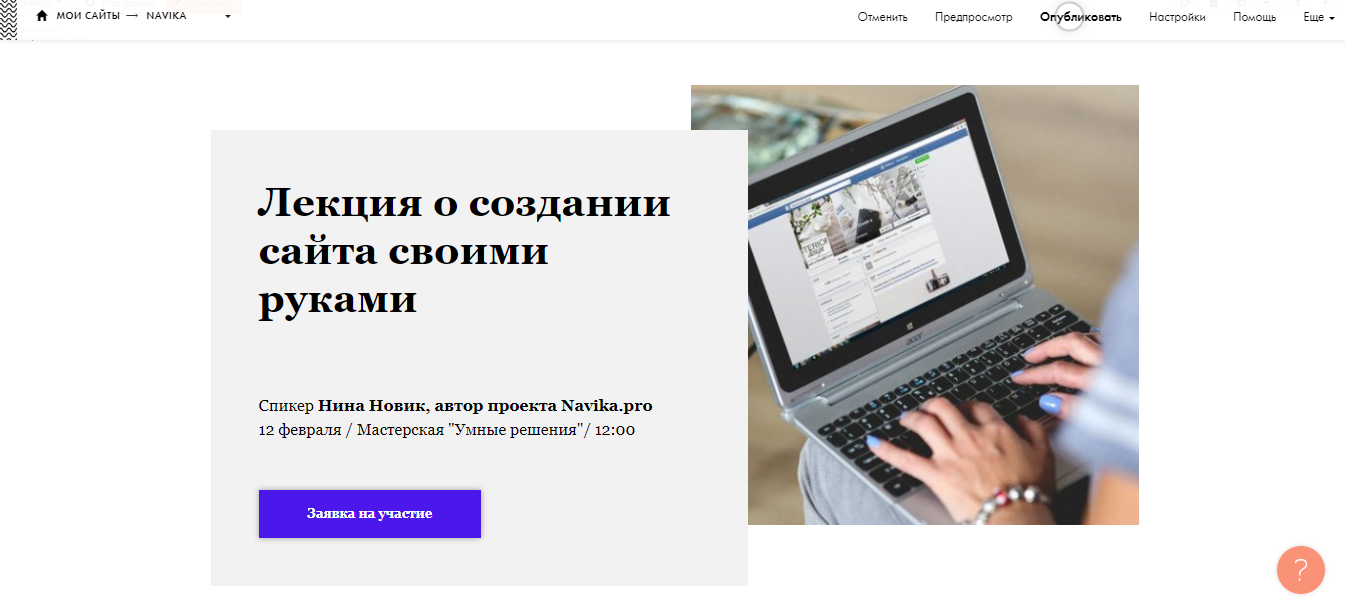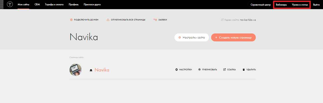 В любой момент вы сможете внести в свой сайт необходимые изменения через личный кабинет, и они сразу же отобразятся в онлайне. Не расстраивайтесь, если в первый раз получилось неидеально. Чтобы усовершенствовать свои навыки в создании сайтов, сервис предлагает собственные уроки и статьи, а также вебинары. Все это можно найти в правом верхнем углу в личном кабинете.