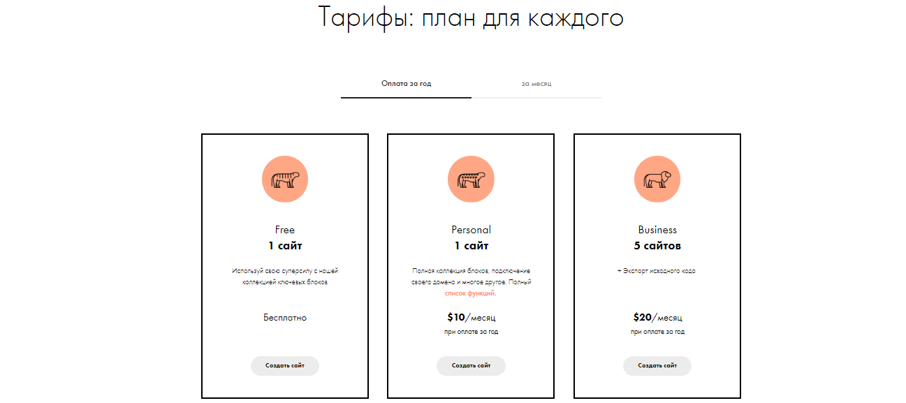 - Business. Все те же возможности тарифа Personal плюс создание до 5 сайтов в одном аккаунте и экспорт исходного кода (вы сможете скачать свой сайт и в последующем использовать его на своем сервисе).