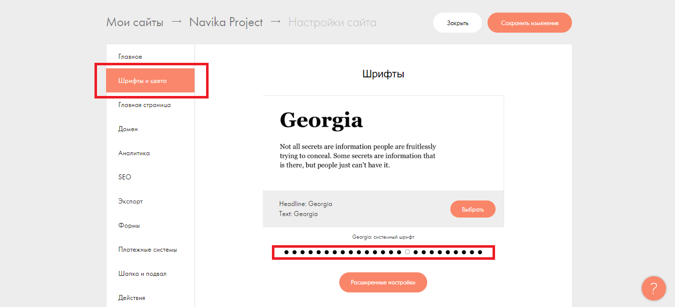 Здесь же выбираем шрифты и цвета. Варианты шрифтов можно прокрутить с помощью точек.
